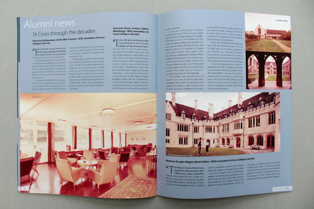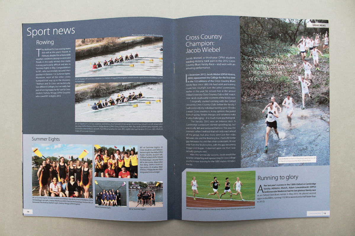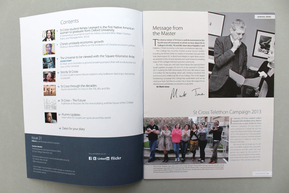 The second issue of Crossword, including a bold cover image that required detailed Photoshop work to make it work as a cover image. Other spreads involved working with scanned images from the St Cross archive as well as some great dramatic shots from a theatre production which we designed to work across a spread for maximum impact with the text.