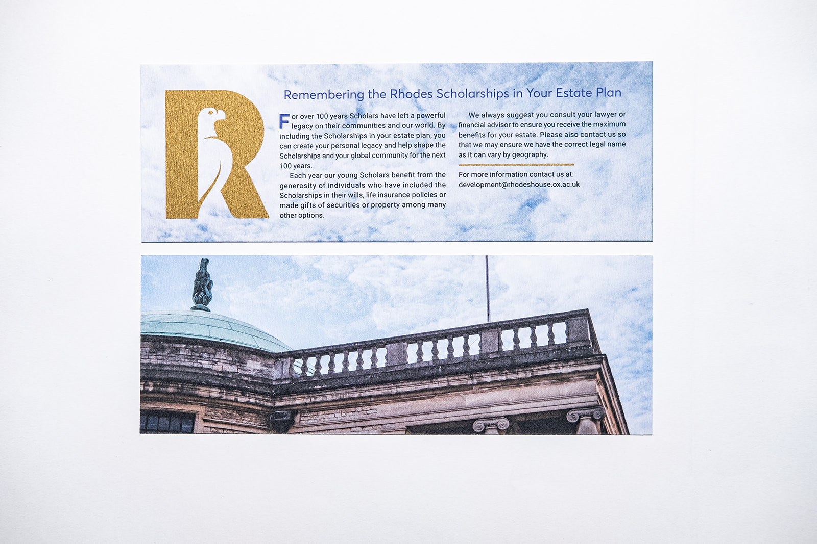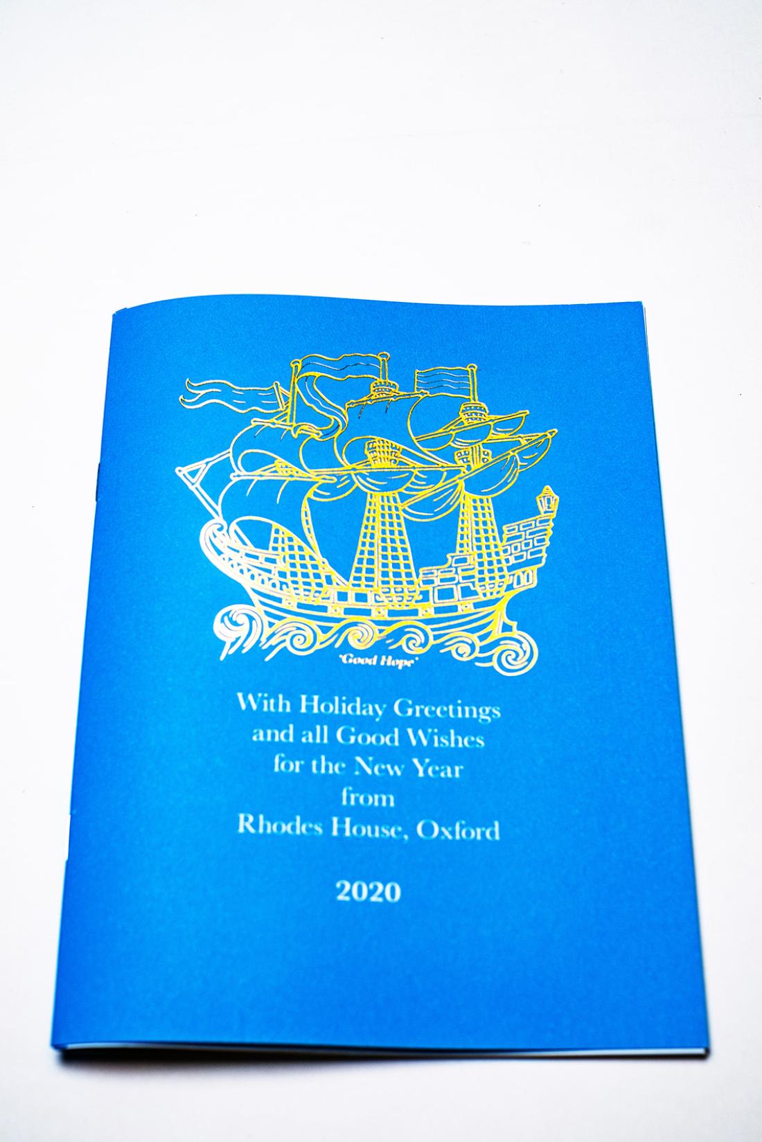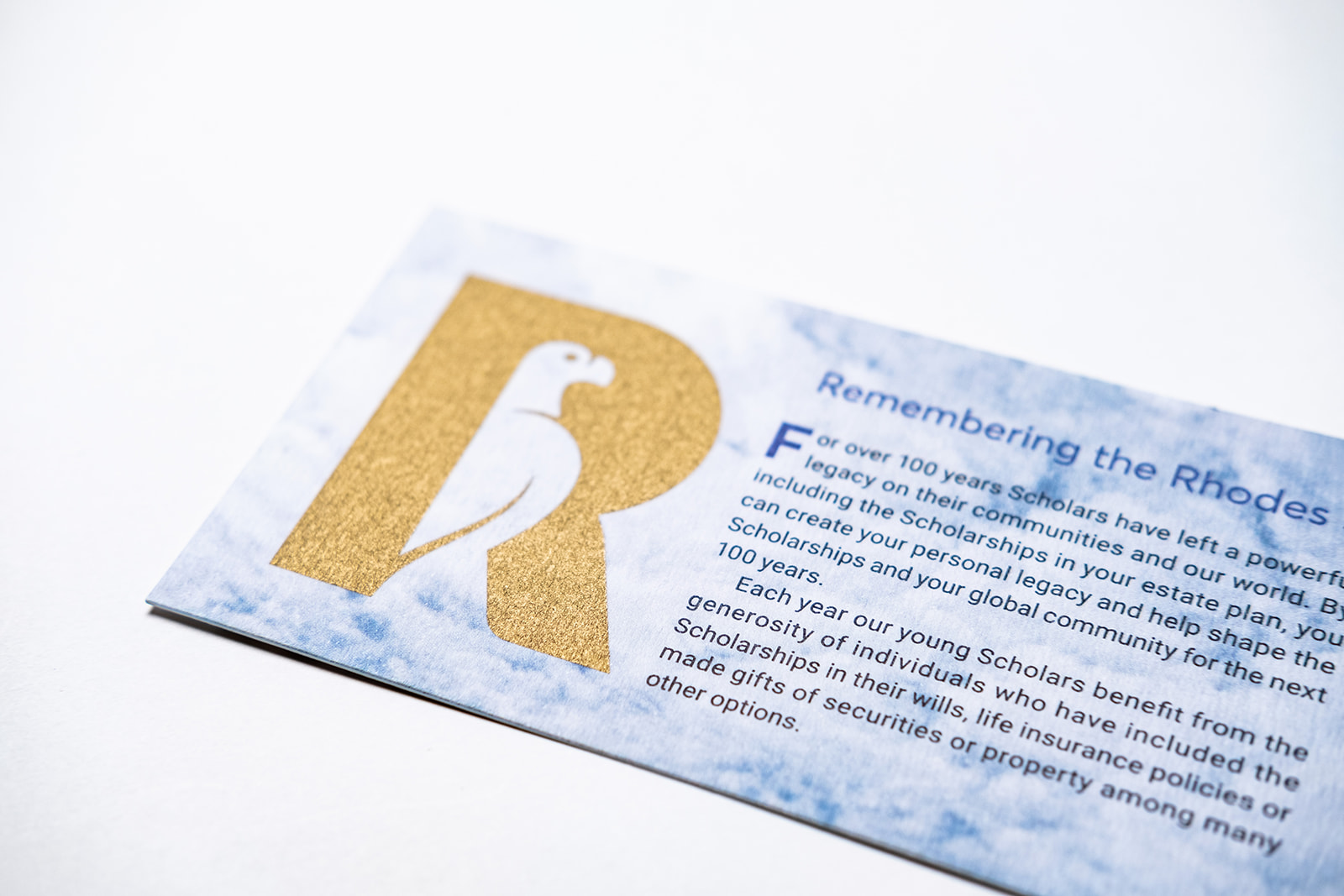Here, a gold foil is applied to a detailed cover illustration. On a solid colour, the gold is particularly strong. The bookmark uses a Pantone metallic dark gold for the logo and line device separating key details.