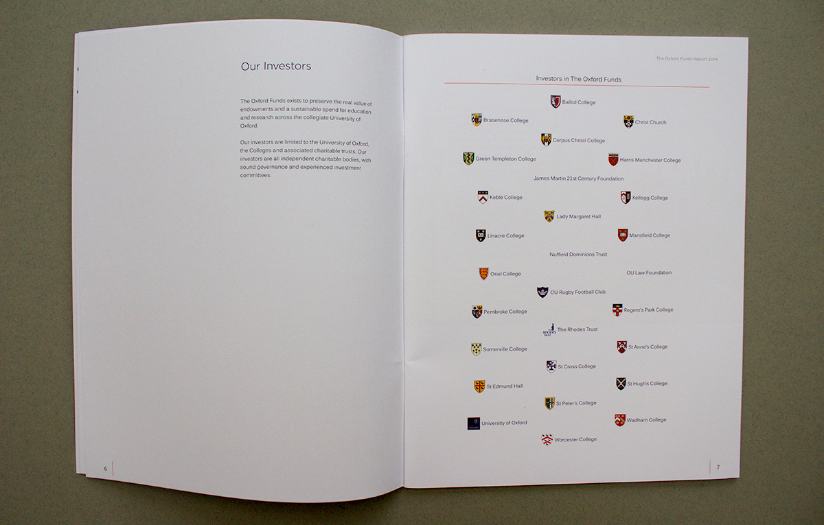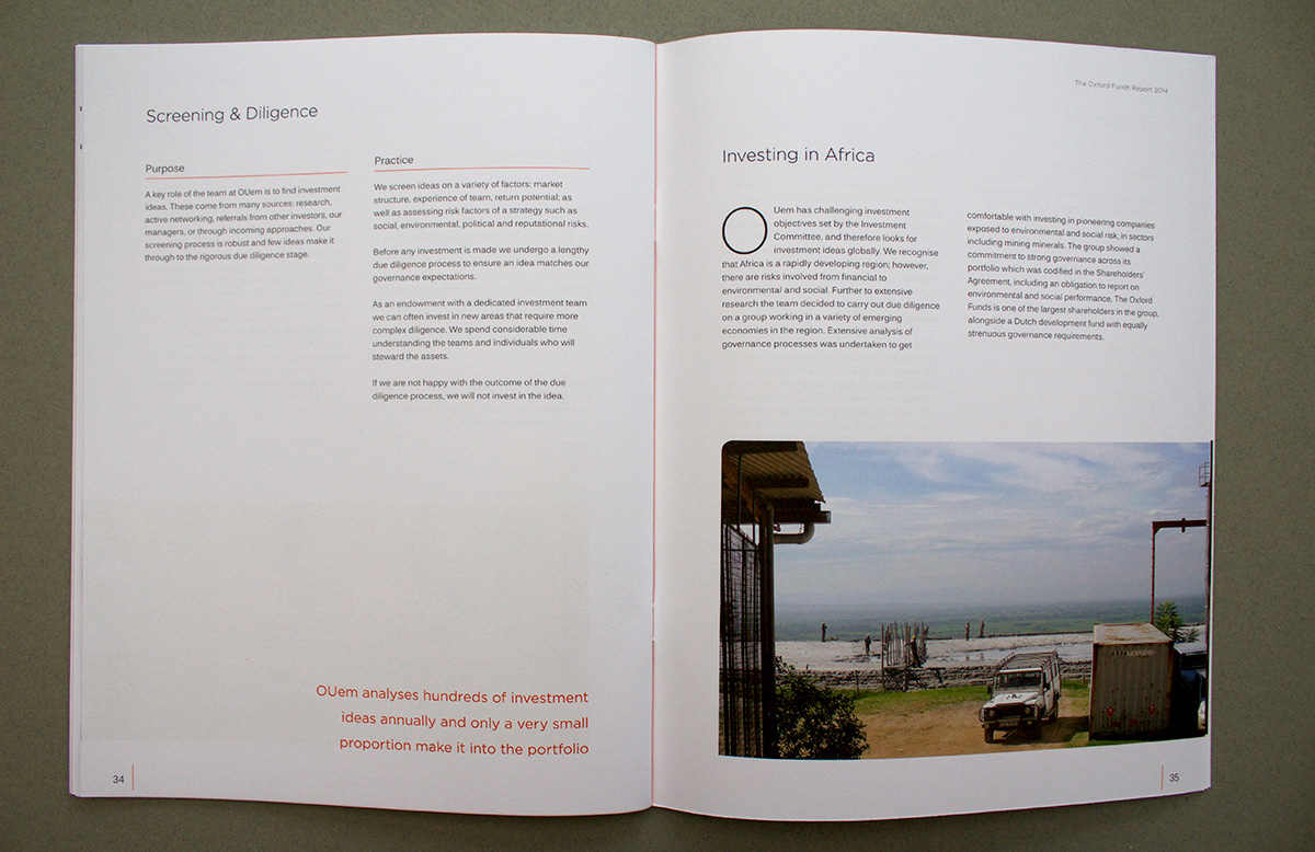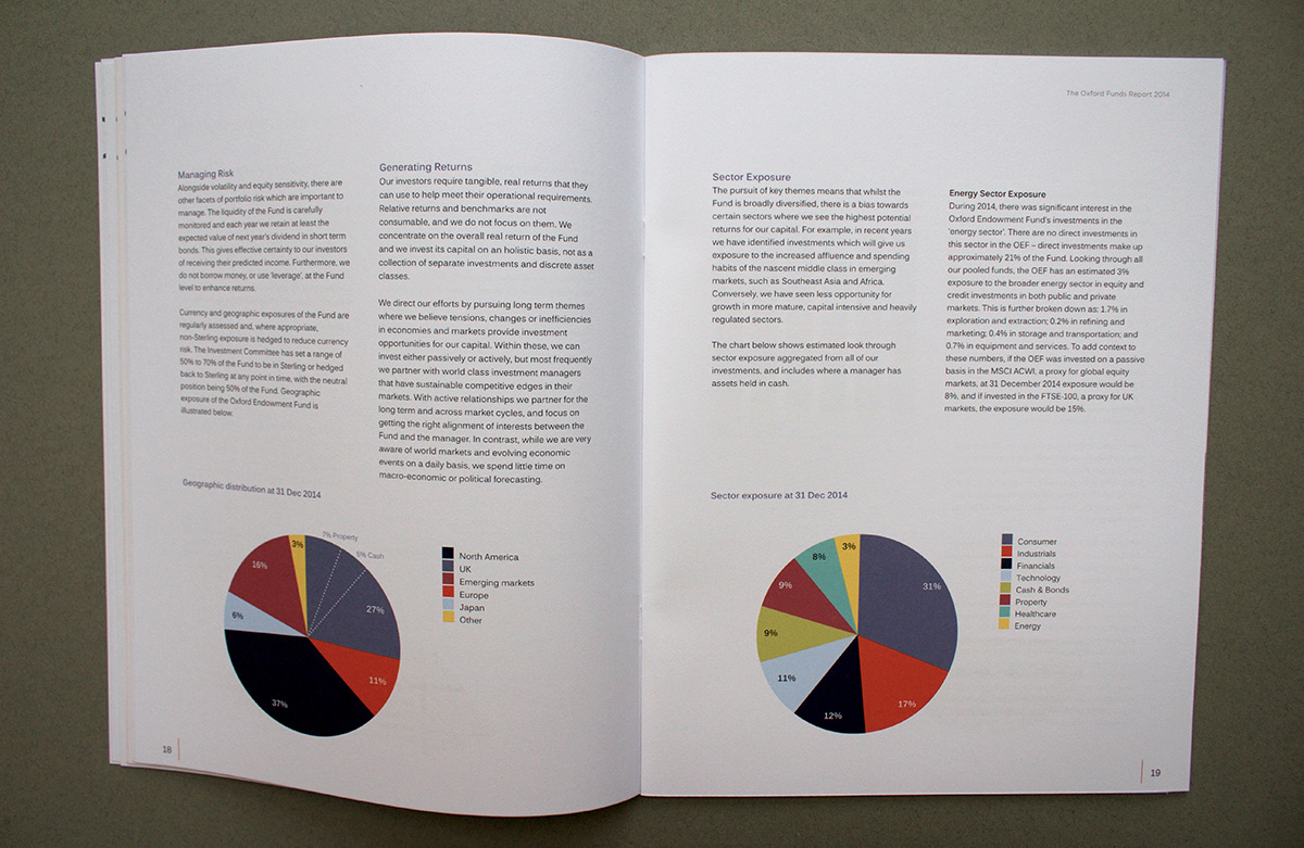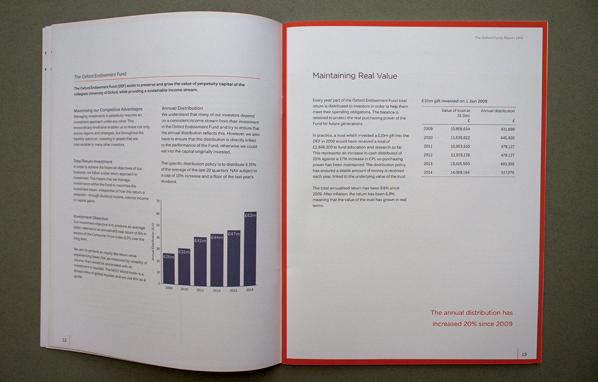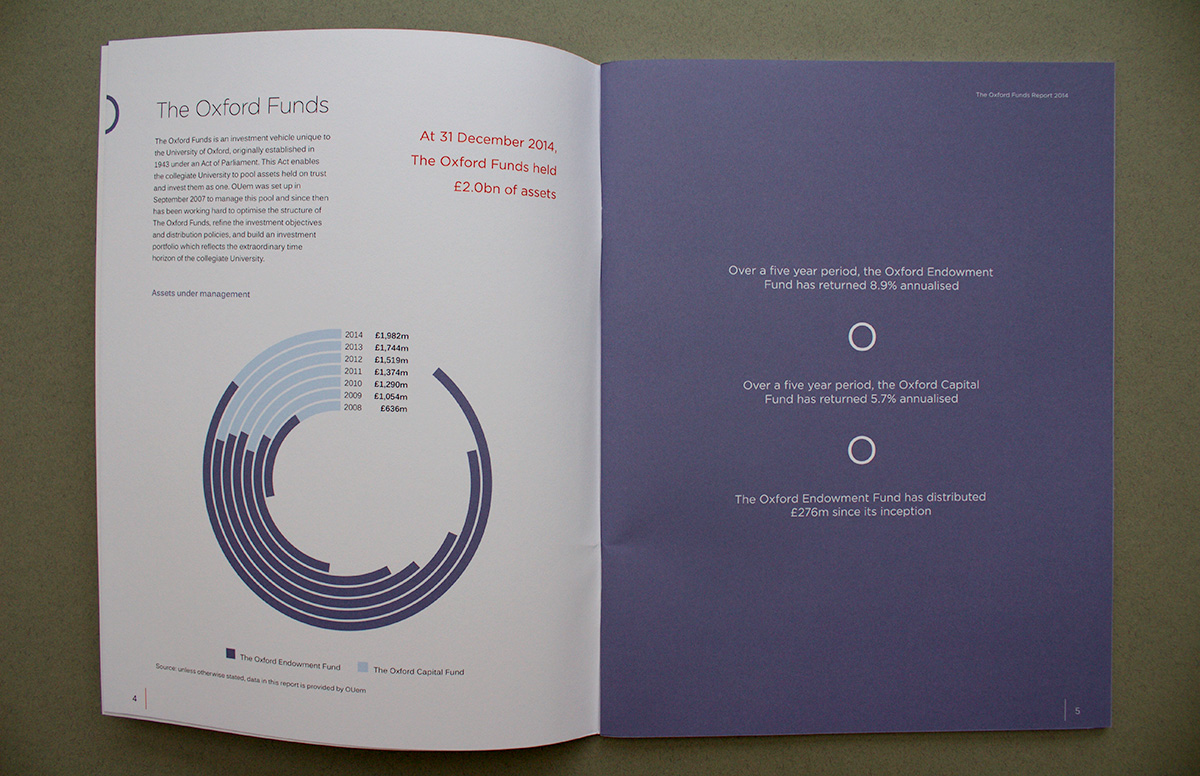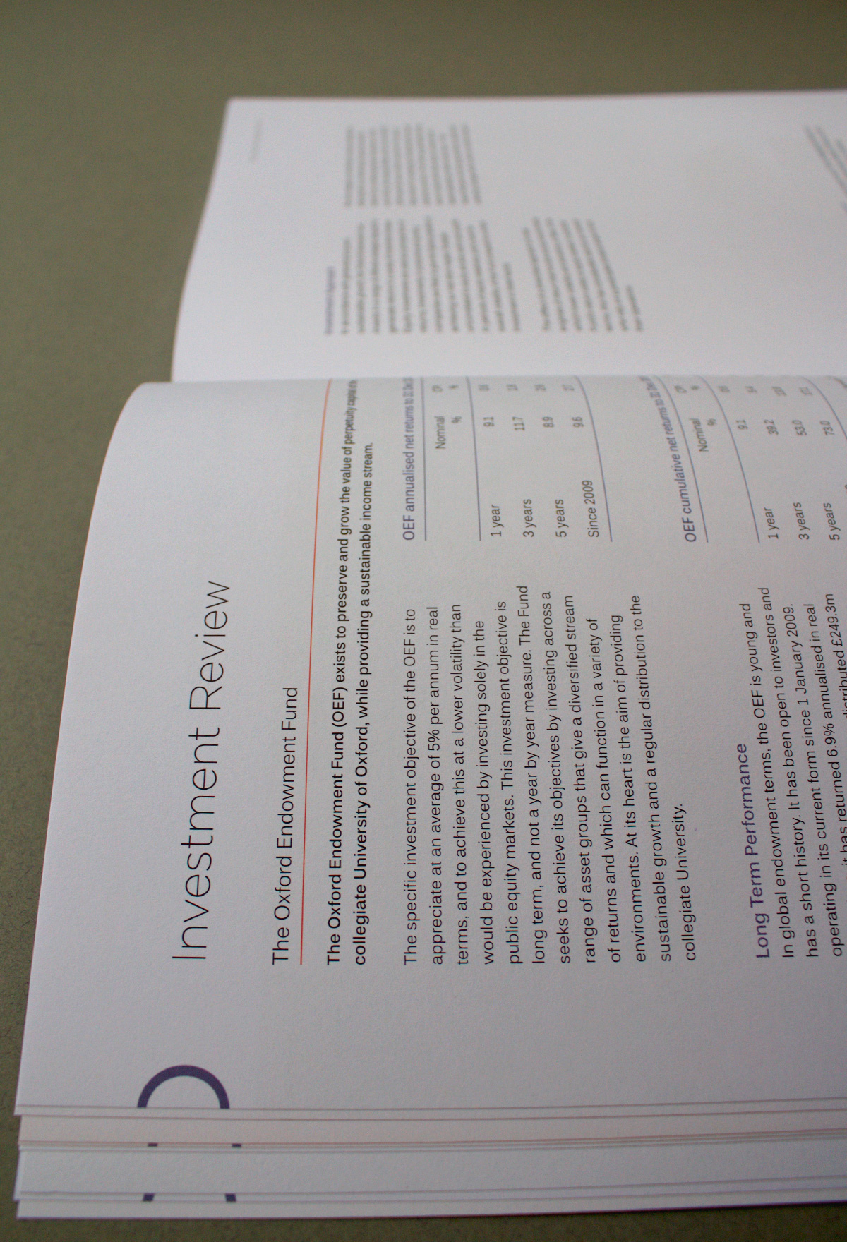 OUem invests gifts donated to the collegiate University of Oxford for the purposes of education and research. We designed their annual report and audited financials to work as a pair of complementary publications. The OUem website makes use of some orange as a feature colour so we developed the use of this to their annual print communications, to help maintain design continuity from digital to print media. Where relevant, images were used infrequently and large for impact. Graphs, tables, charts and other graphic visuals use a bold, limited palette, consistent with and evolving from the existing brand visual identity for OUem.