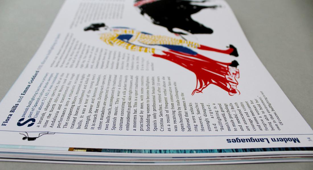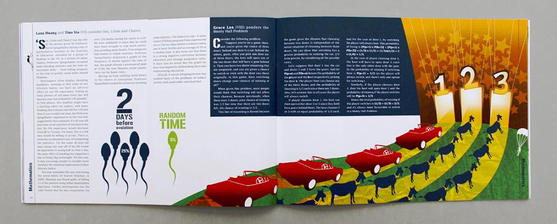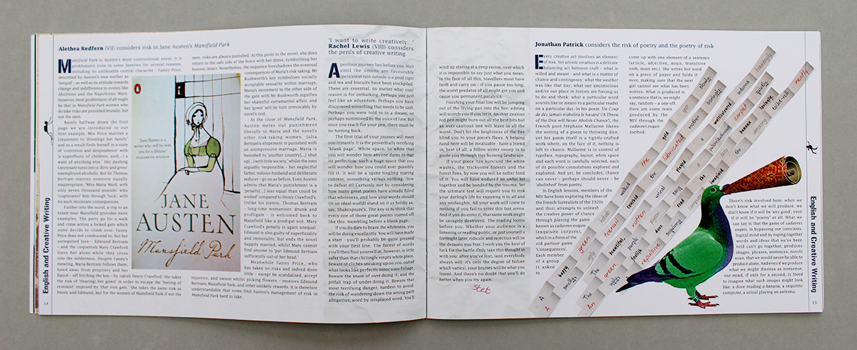 This issue of Paulina is the third we have designed for St Paul's Girls' School, their annual magazine. The theme was 'Risk' so we developed a graphic for the margin to work as a flip-book; a character climbing up the left hand pages and then parachuting down the right hand pages - risky. Other fun elements to design for the text included a letter from a gladiator, asteroids and a trip to CERN, a graphic for the probability Monty Hall problem, and for the English department, an illustration for the cadavres exquis game, used by the students to help them to write 'risky' poetry.