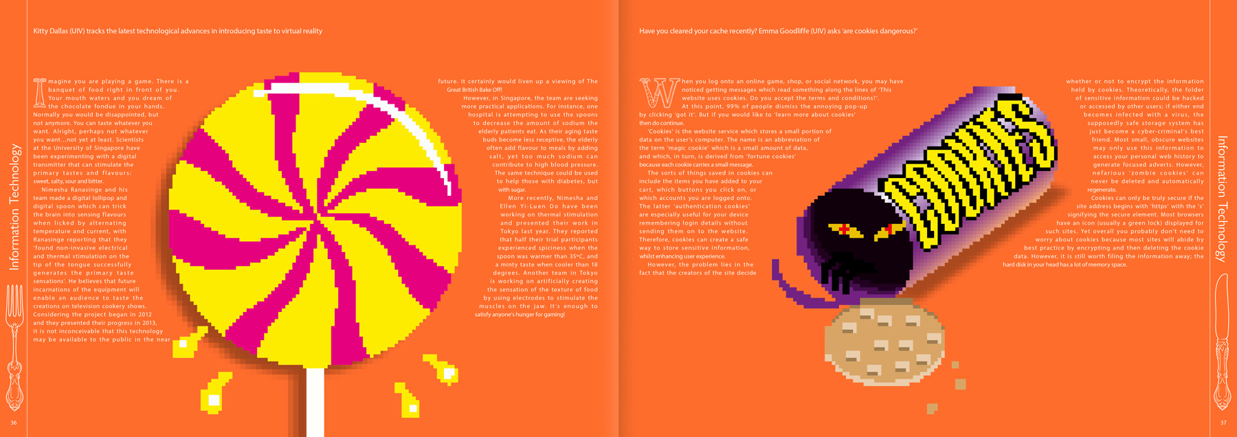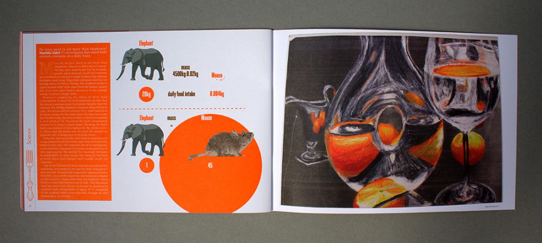 Subject specific graphics we designed for this edition included amongst others: Tim Peake and student physicists 'beamed up' with their space plants; two food bank pieces designed as food packaging; an illustration of Donald Trump 'baking' a new federal cake; an illustrative mash-up of Italian idioms and the pantry of the French language (including Proust on madeleines and a Camembert roundabout...); an infographic to show the food intake of mice and elephants in comparison to their relative mass; and Italian opera singers tempting each other with spaghetti (see Rossini's The Italian Girl in Algiers for an explanation).