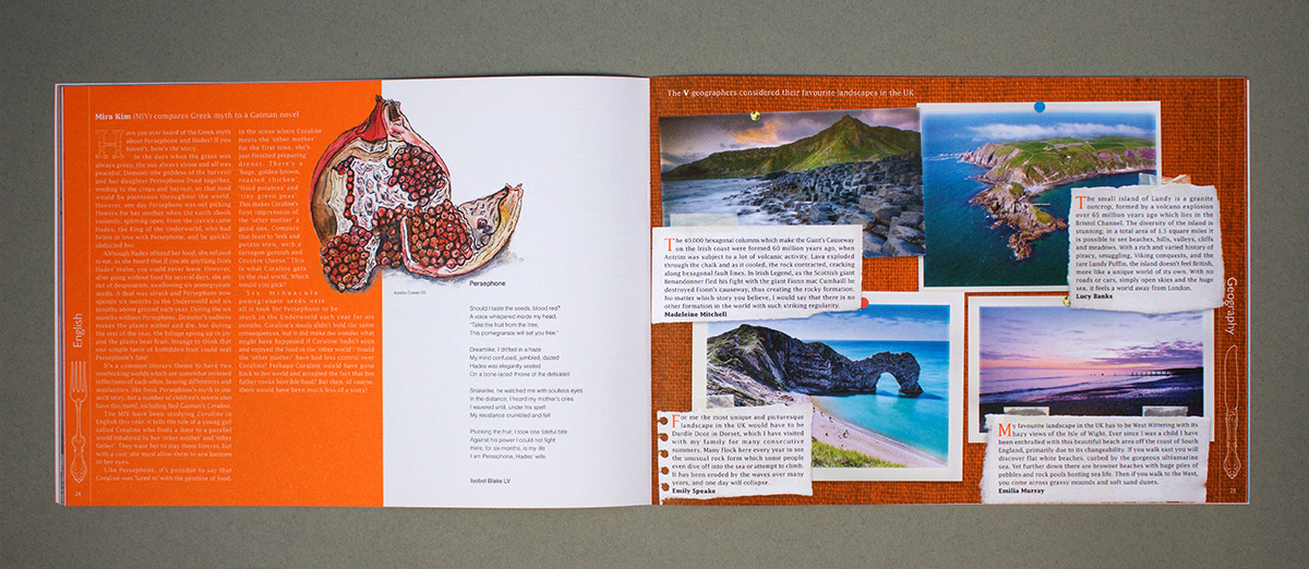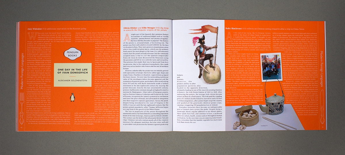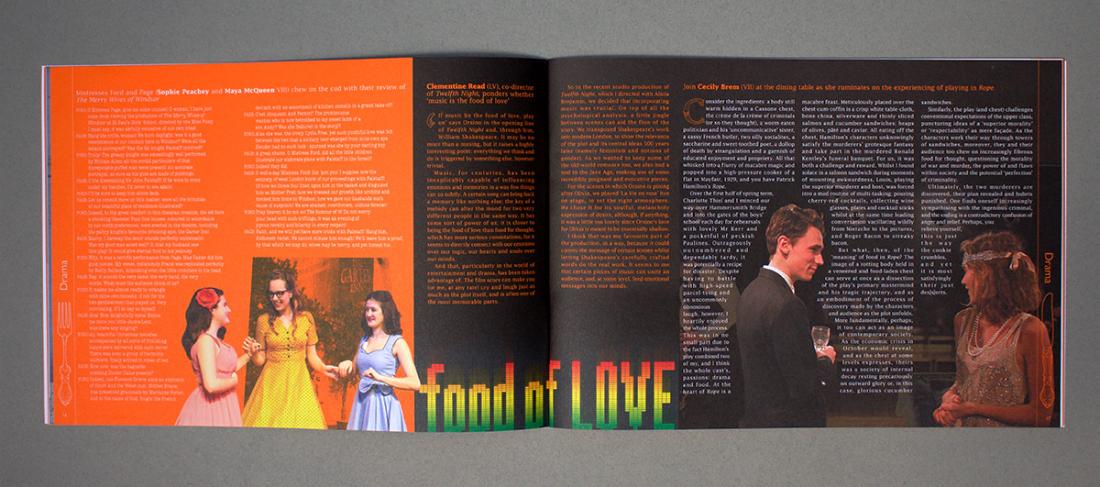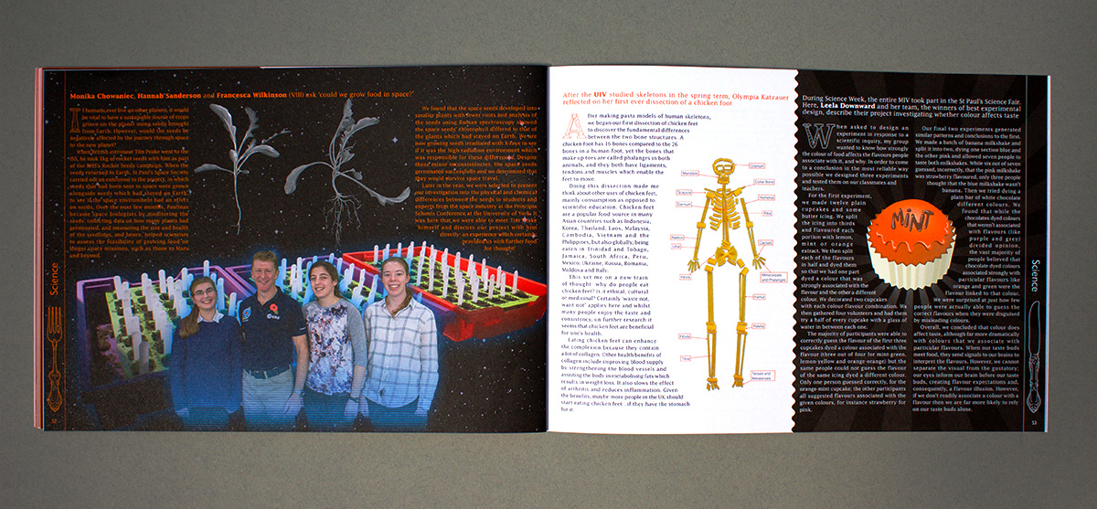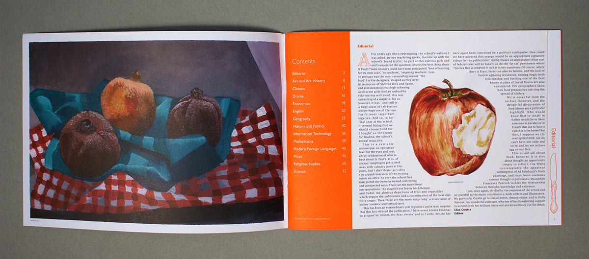 Each annual edition of the St Paul's Girls' School magazine Paulina has a theme; this year it was 'Food for Thought'. We design key graphic features which are consistent through each edition. For this issue, we made good use of Pantone Orange 021 to add vibrancy and a lush richness of colour, in keeping with the idea of glorious food. The borders always include the subject title and this year had the addition of a knife and fork, so each spread took on the appearance of a place setting. We used the cutlery handle engraving as the inspiration for the design for the bespoke drop caps.