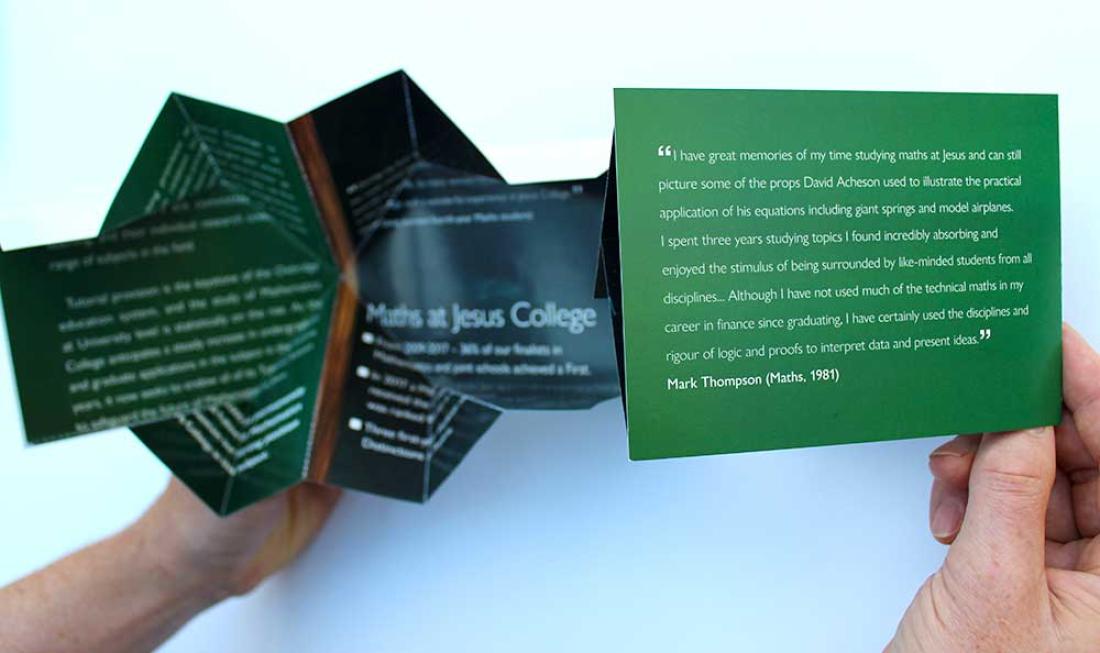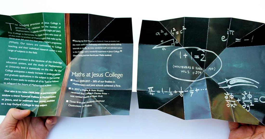 Jessus College wanted a unique give-away for a special event. We suggested a pop-out brochure, often used for maps but in this case, the perfect vehicle for a short message about the value of Mathematics and supporting this academic study at Jesus College.