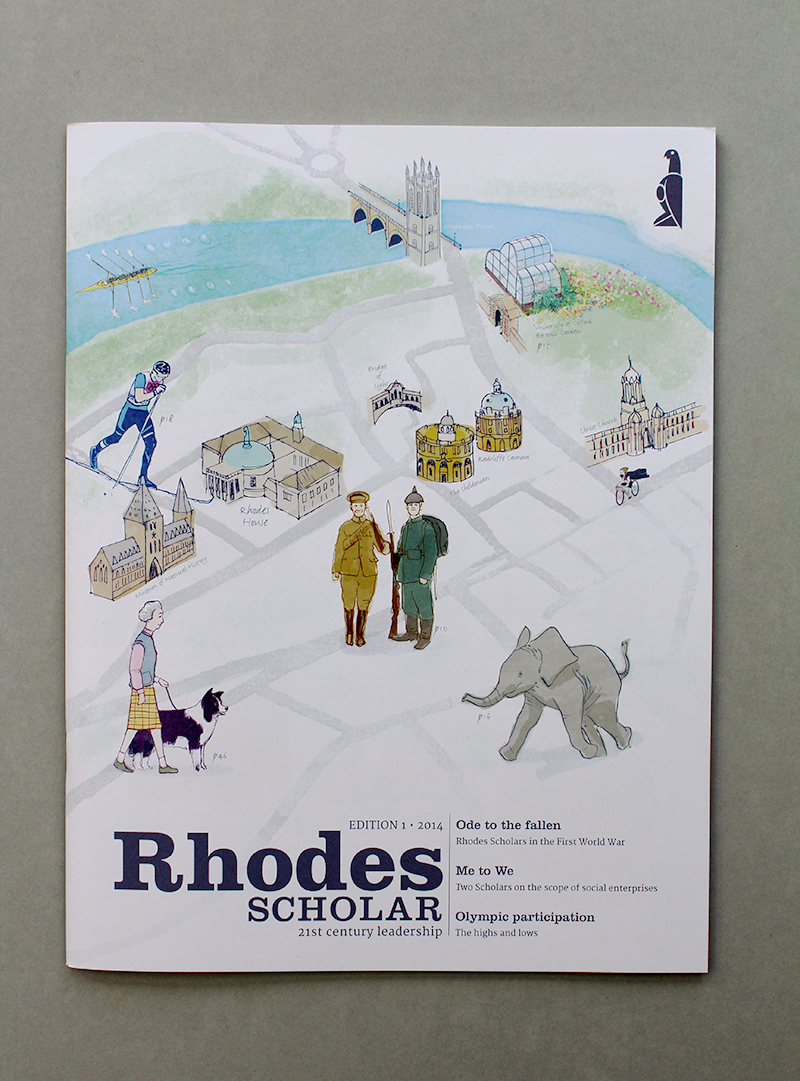 To give the launch issue a stand-out cover, we developed and drew an illustrative visual, drawing on key feature articles from the magazine and placing these on a street map of Oxford (with Oxford iconic landmarks, Rhodes House being in the centre), to guide the reader into the magazine, and to help them call to mind their time in Oxford as a Rhodes scholar.