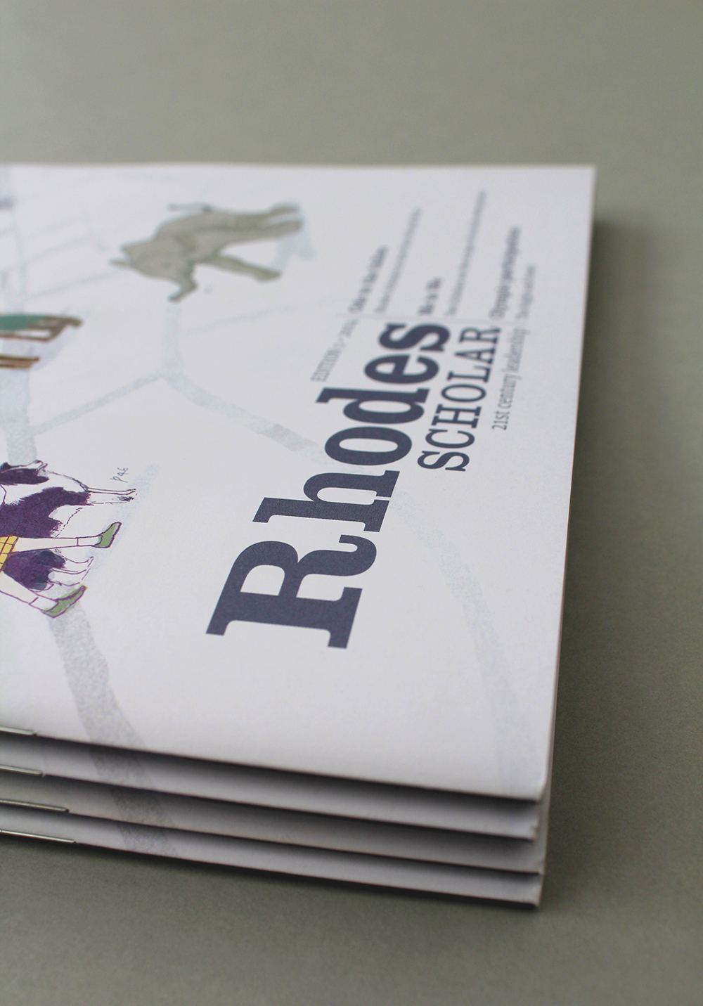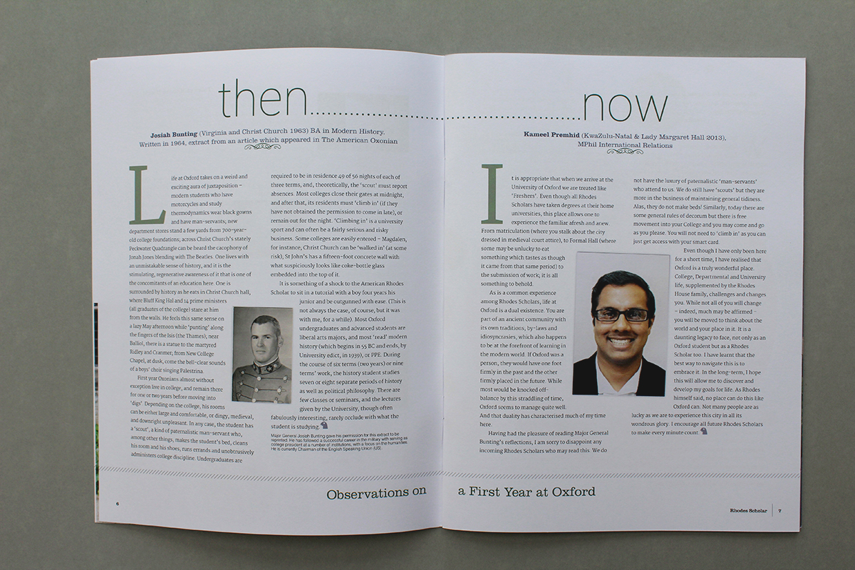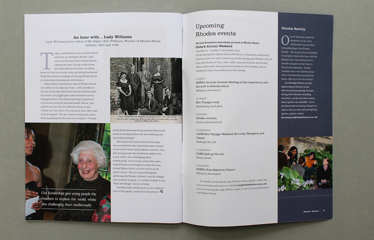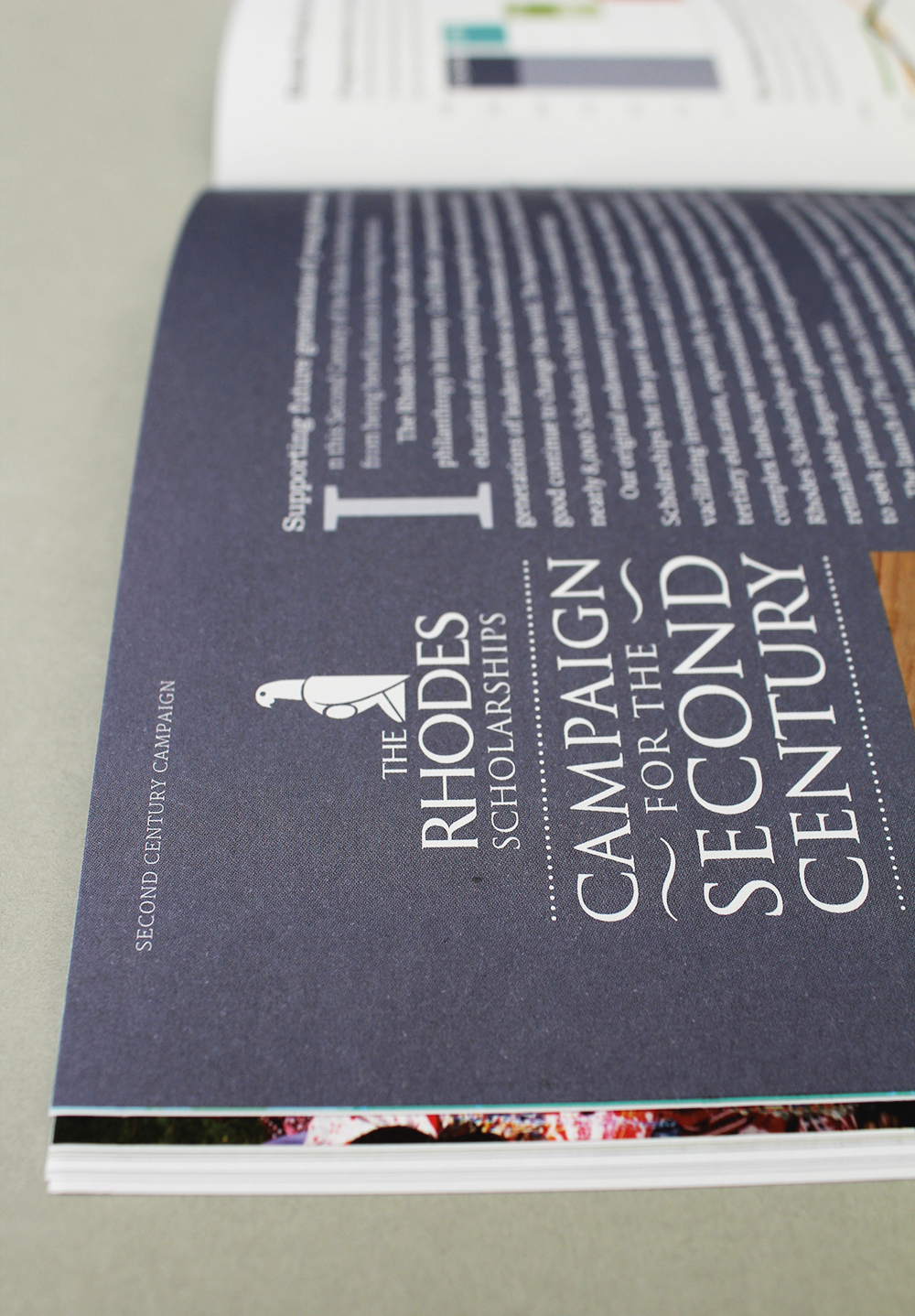 The Rhodes Scholar magazine is a new publication for The Rhodes Trust. We worked with the Communications Manager to design the magazine to reflect the dynamic Rhodes community both past and present. Core fonts, colours and layout give the magazine a discrete identity but each spread was given a different graphic treatment to evoke the vibrant and distinct character of Rhodes scholars.