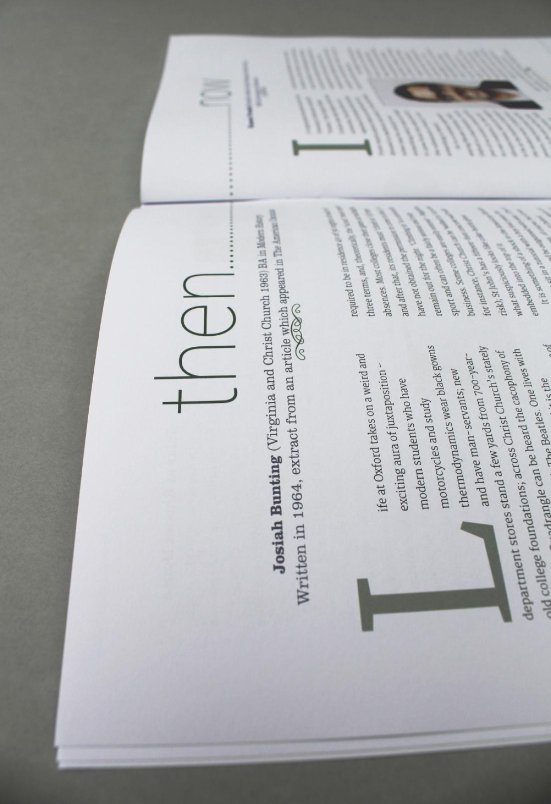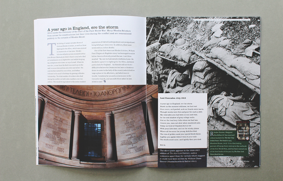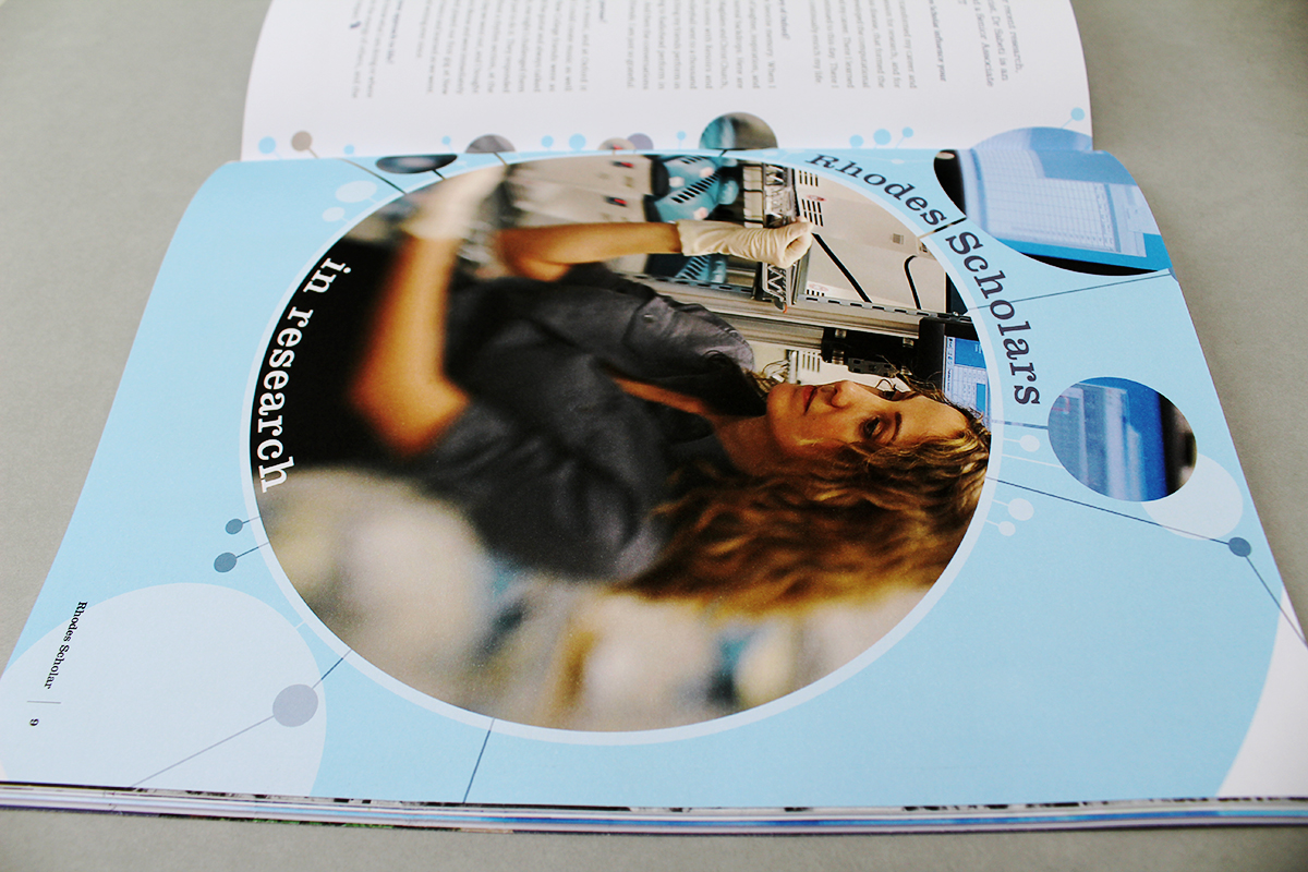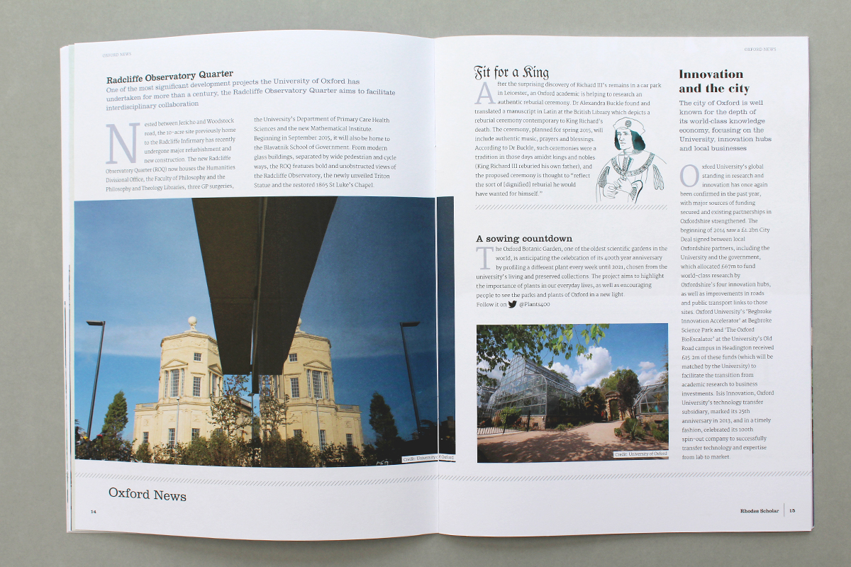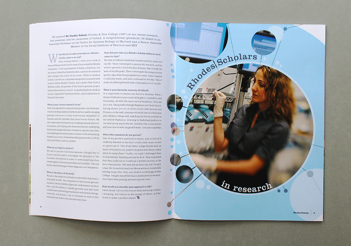 The Rhodes Scholar magazine is a new publication for The Rhodes Trust. We worked with the Communications Manager to design the magazine to reflect the dynamic Rhodes community both past and present. Core fonts, colours and layout give the magazine a discrete identity but each spread was given a different graphic treatment to evoke the vibrant and distinct character of Rhodes scholars.