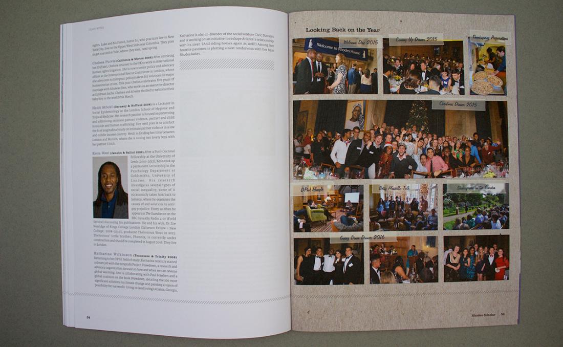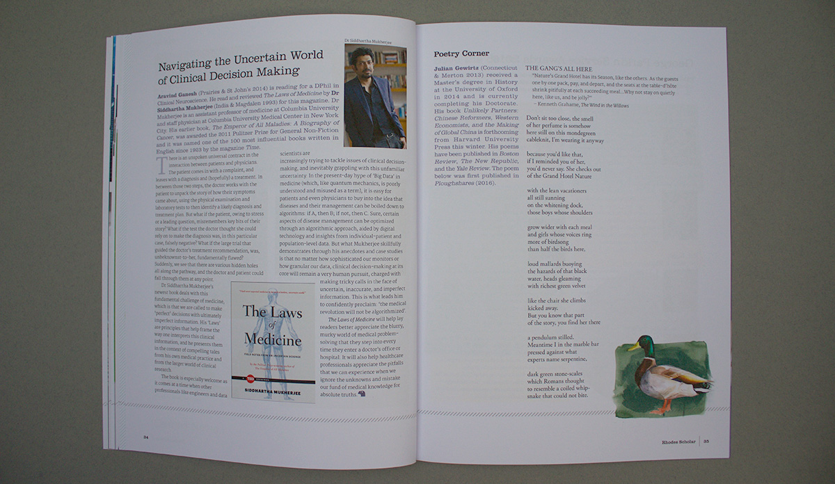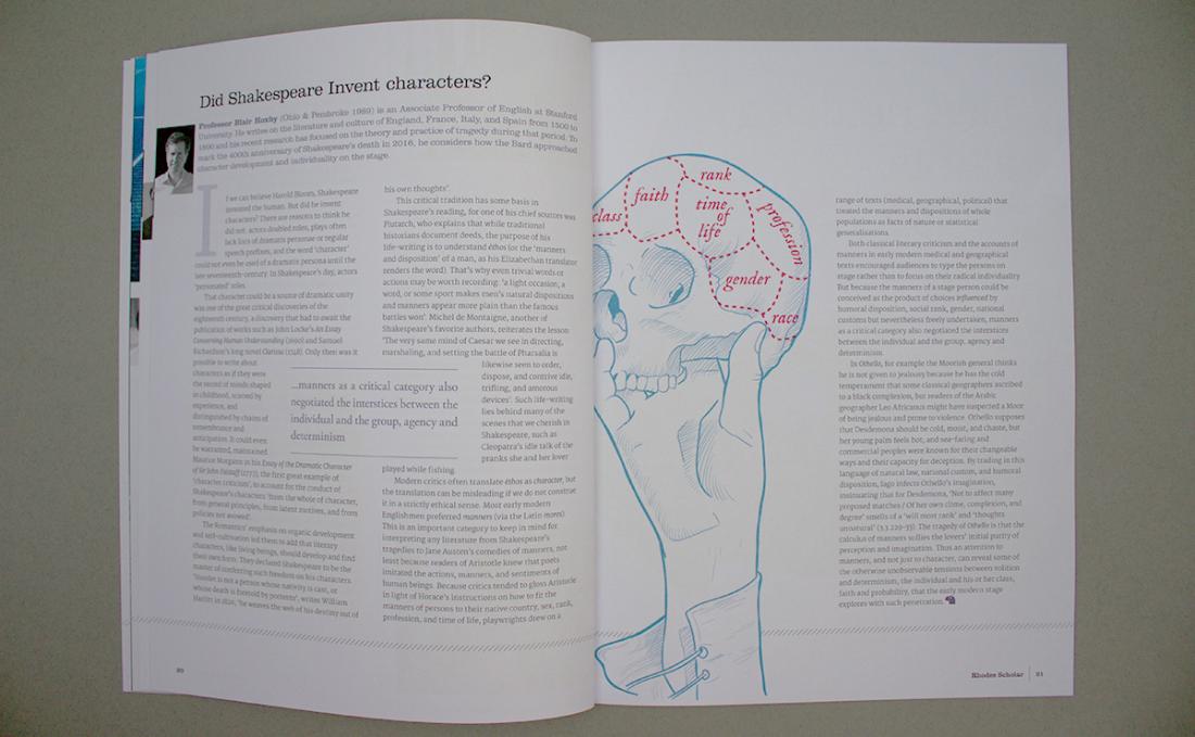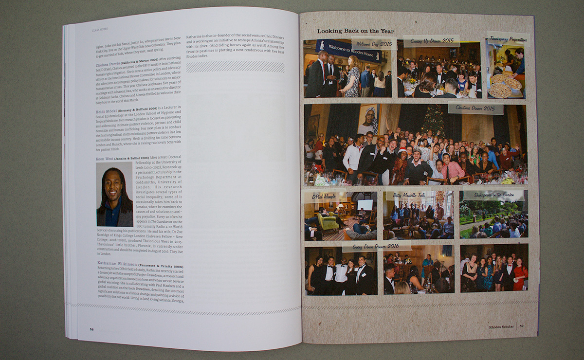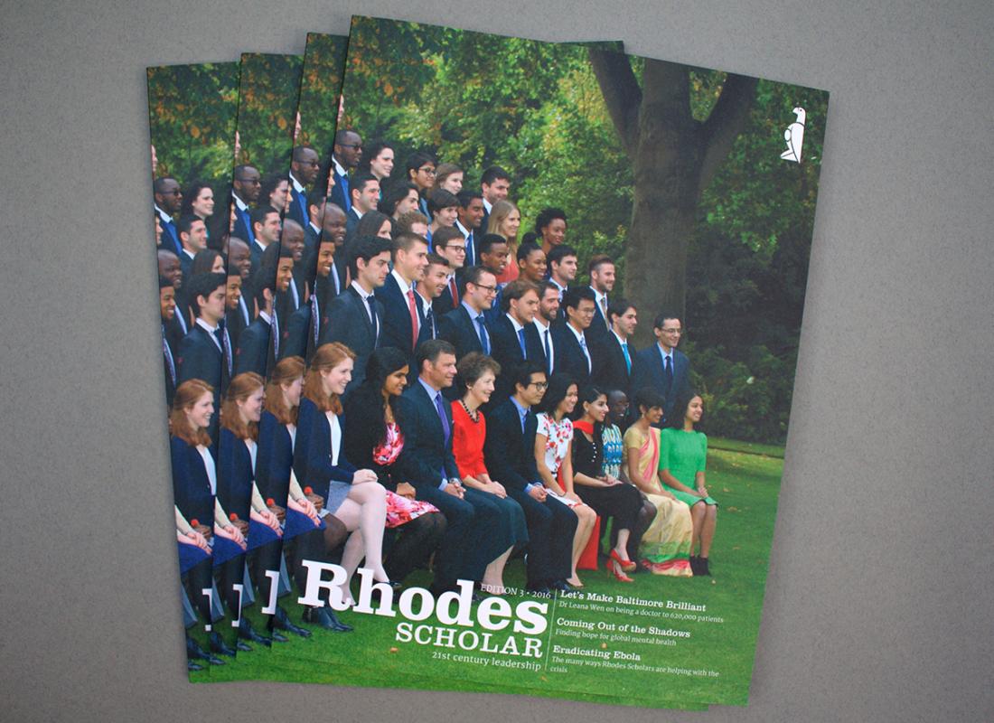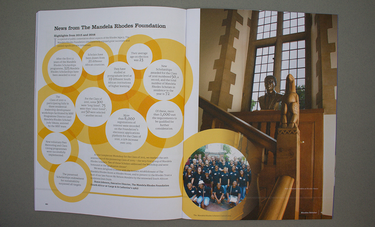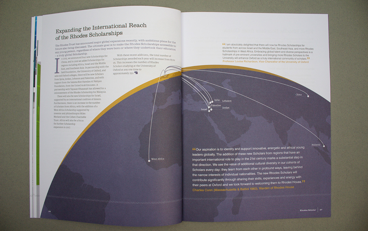 In this 2016 edition of Rhodes Scholar, we highlighted: the development of the Scholarships with their new partnership with The Atlantic Philanthropies; the work of Scholars across the world in the medical and health sectors; recognising inspirational educators nominated by current Scholars; the growing global reach of the Schorships with new regions and nations, to name a few. We used the design established with the first issue as the backdrop for new layout interpretations plus illustrations and graphics for articles including a drawing for a piece which discusses if Shakespeare invented characters, a graphic to visually reflect the impactful work of Scholars in the fight to eradicate Ebola, a 'photo album' pictorial of a look back on the year, a world graphic to show the international expansion of the Scholarships... and a mallard.