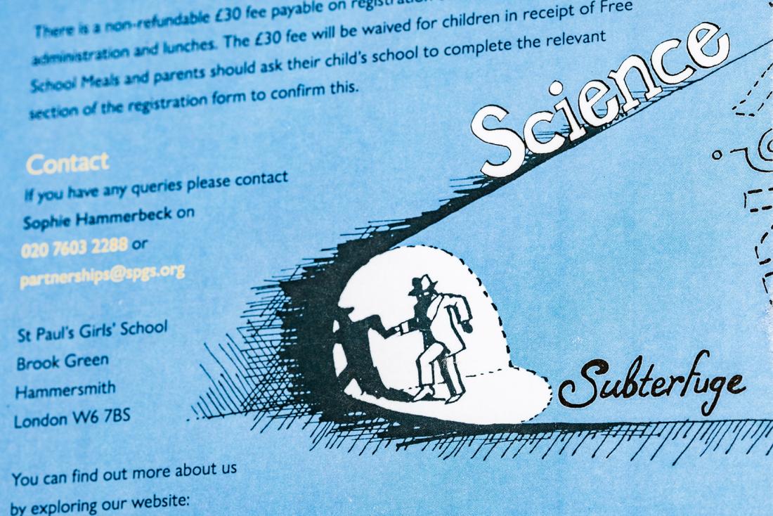 We used photographs from a previous Summer School and adapted and illustrated these to work with the theme for the new Summer School: Science, Secrets and Subterfuge.