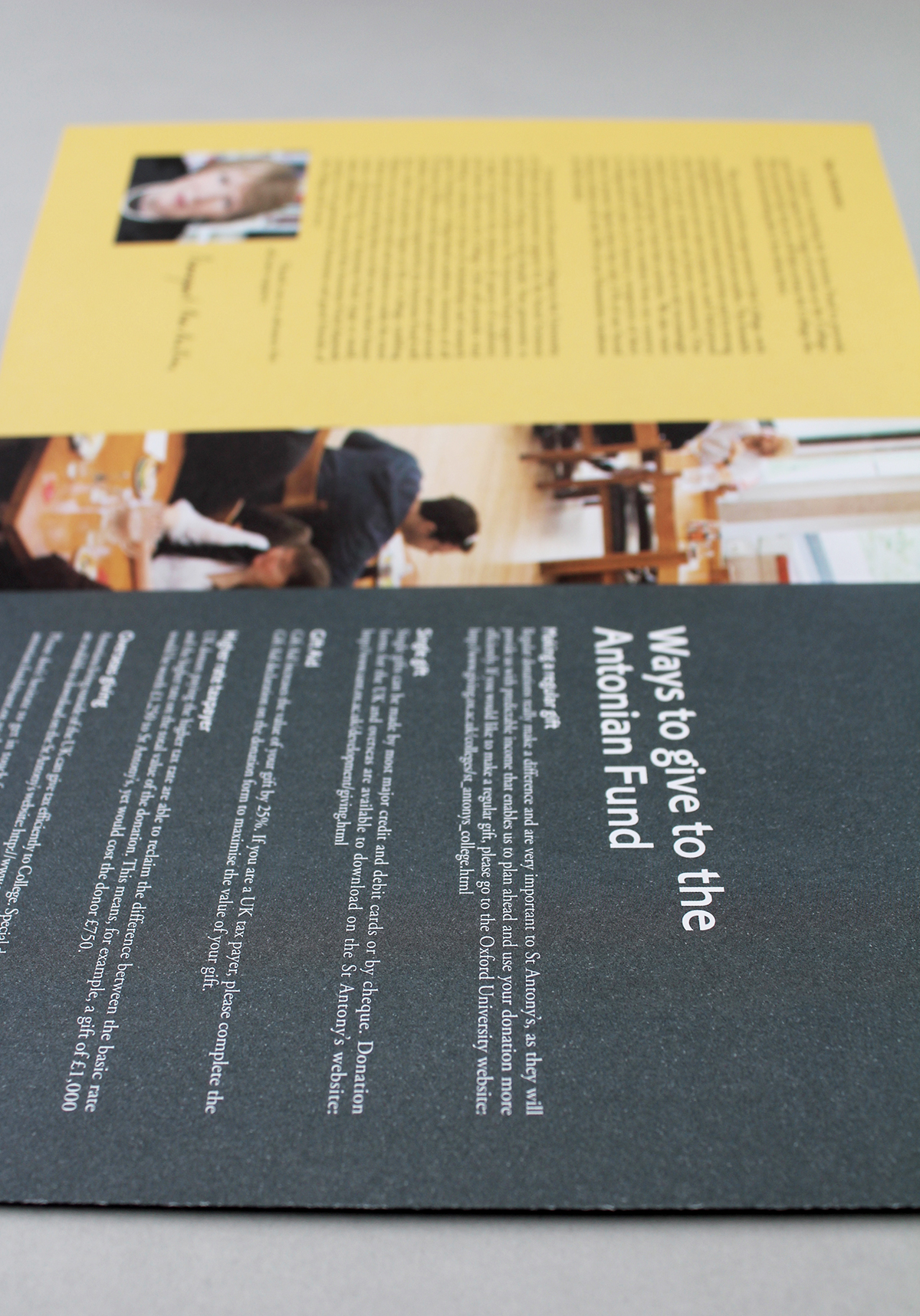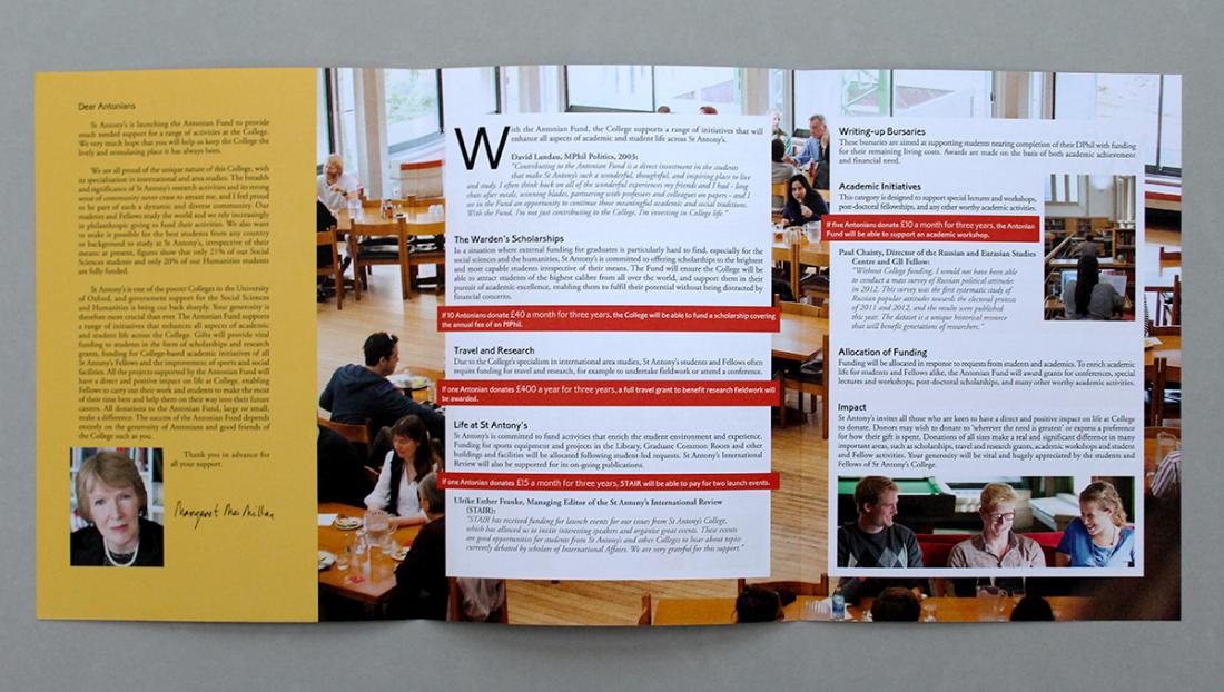 After redesigning the St Antony's alumni magazine, we were asked to develop the same design and style to work with the annual fund brochure.
