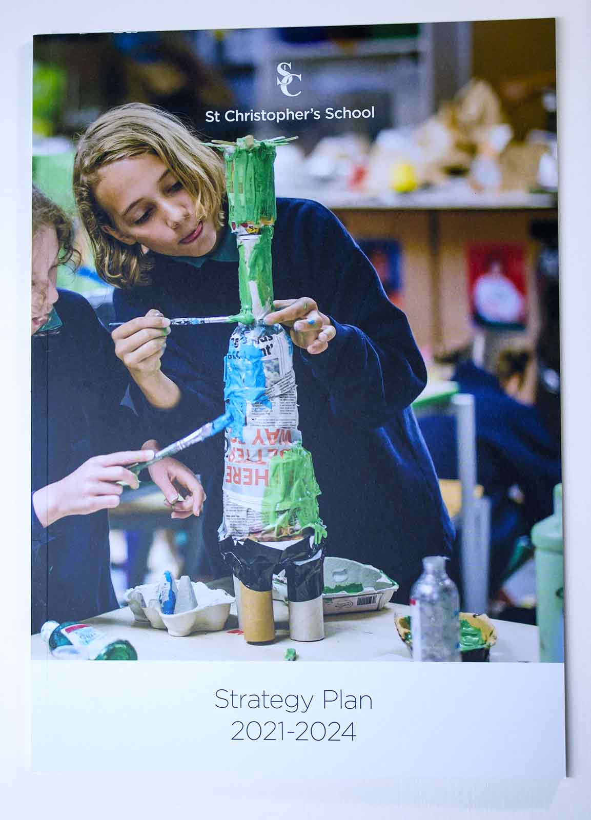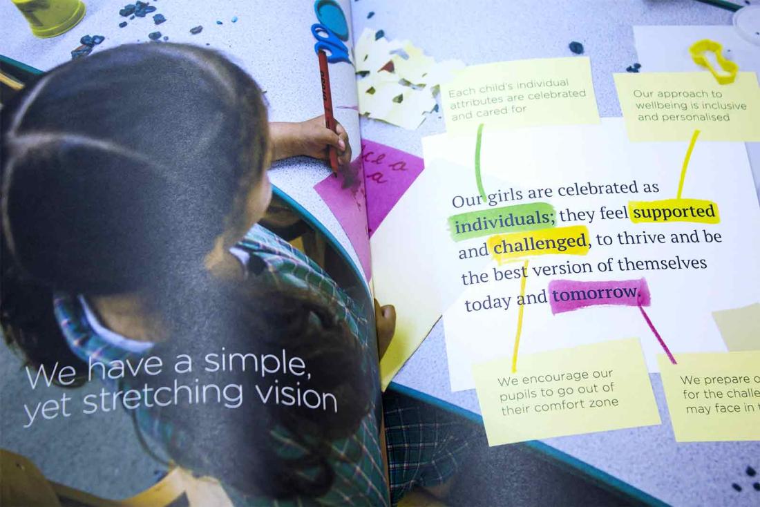 St Christopher's School needed a brochure to communicate their new strategy plan for the next three years in the development of the school. The brochure included using commissioned imagery from our preferred photographer, enabling us to use lively, documentary style photographs large, across spreads, for great impact. The imagery also allowed us to add features such as post-it notes and highlighted text to photographs so the students appeared to interact with the text as graphic elements.