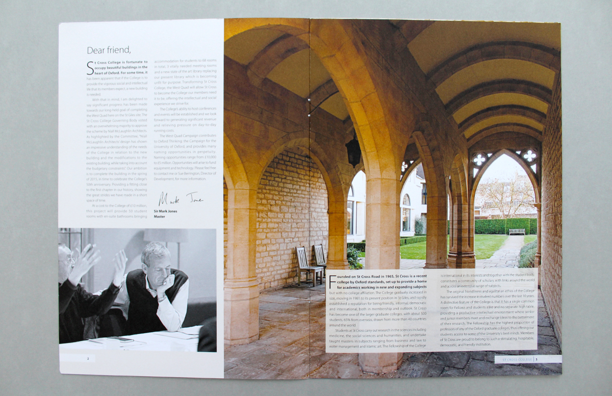 2015 is the 50th anniversary of St Cross College, Oxford. The College was keen to raise awareness and funds for their plan to complete the West Quad to celebrate this landmark anniversary and to secure the development of the College at the forefront of academia and as a significant university community.