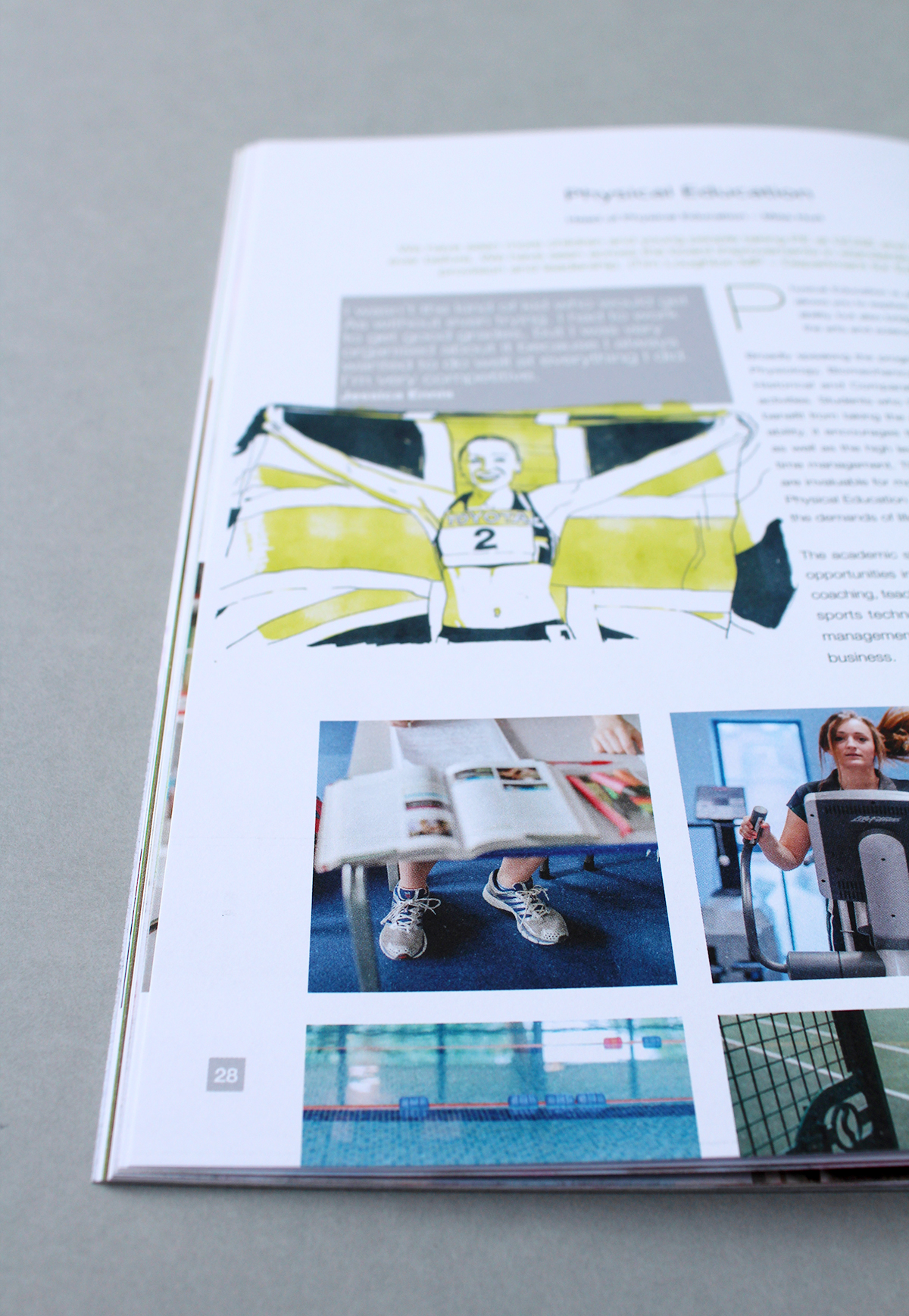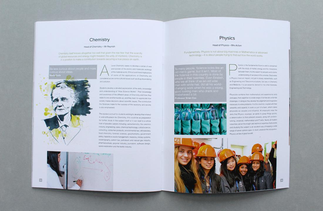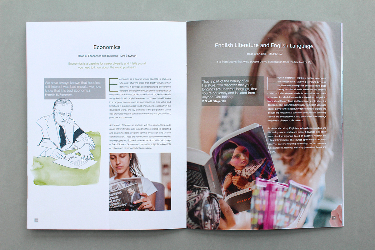 This is the second Sixth Form brochure we have designed for St Helen's. This was designed with the school's Information brochure. The two publications were launched as the first in a series of new print materials for the school. A series of illustrations of well-known personalities, with a quote attributed to them about the relevant subject, were commissioned. The illustrations use an energetic, loose style to convey the lively nature of studying at A Level. The brochure draws on the green from the brand guidelines used to identify the Sixth Form as distinct from other areas of the school.