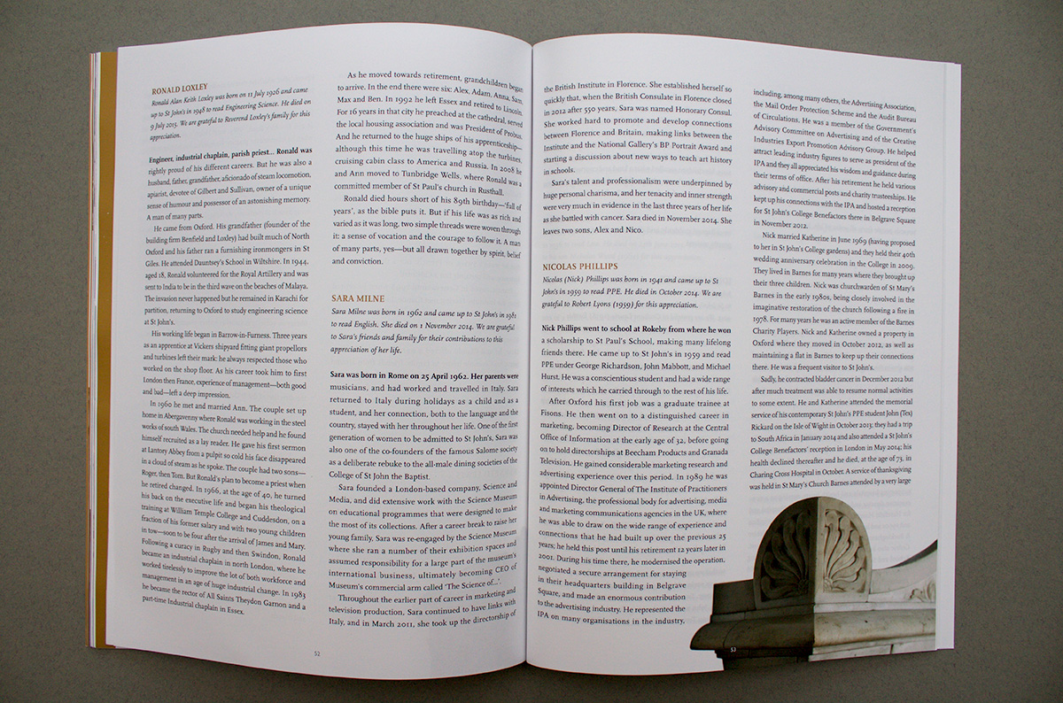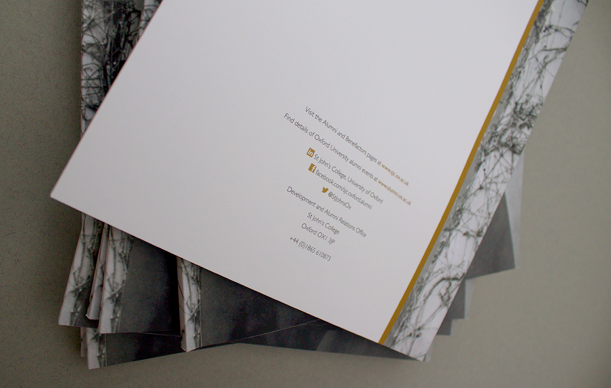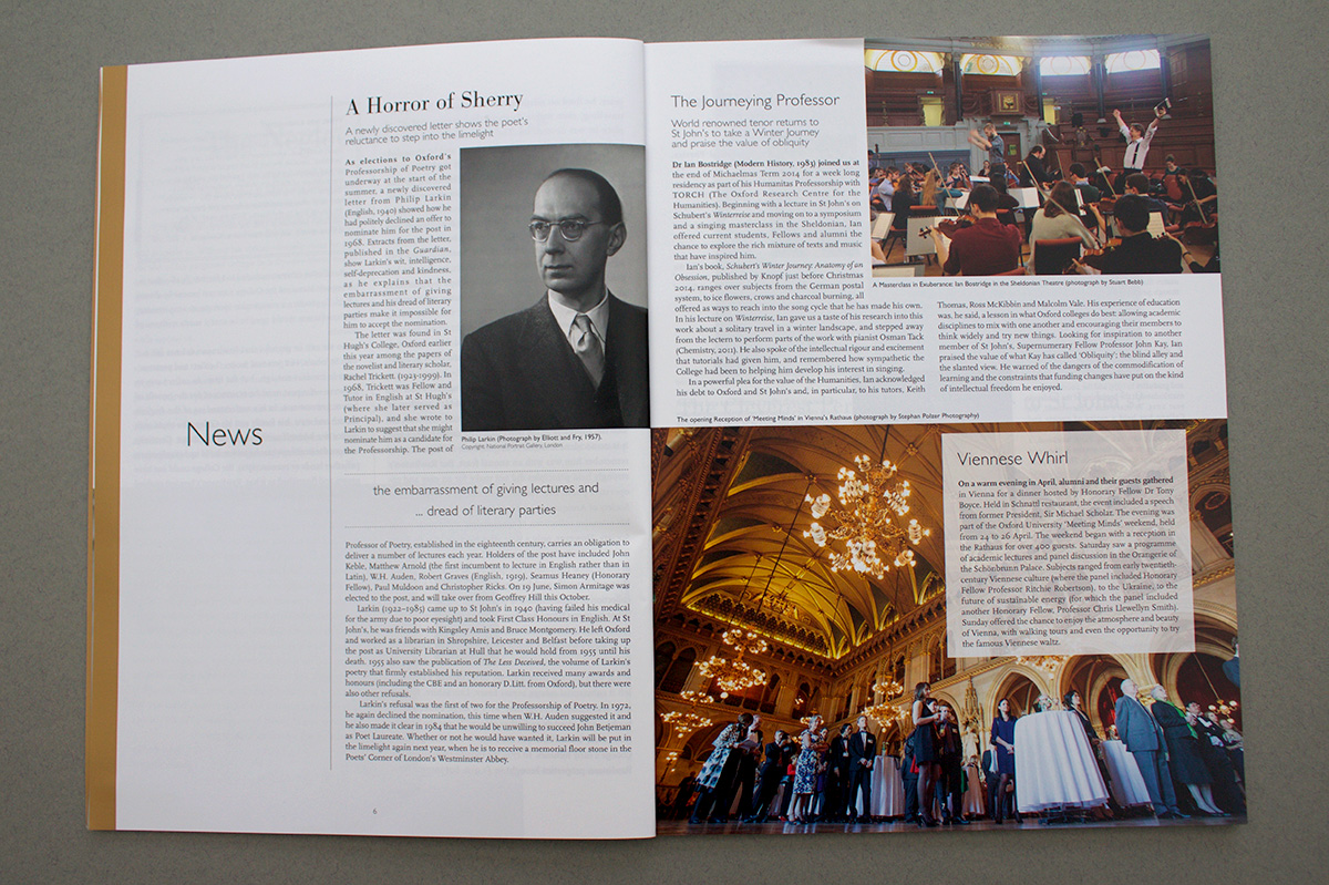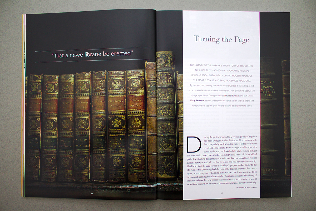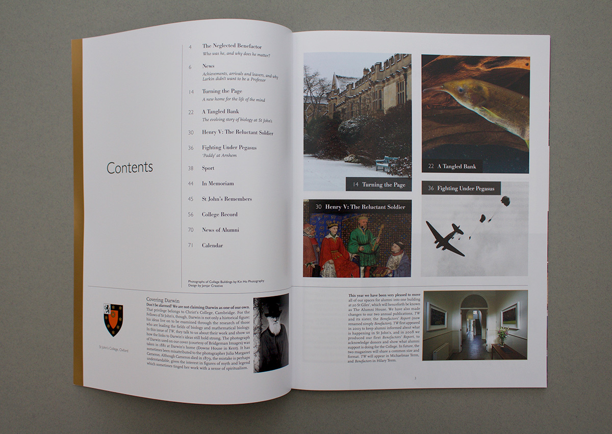 We were commissioned by St John's College, Oxford to redesign their annual magazine for alumni, entitled TW after the College founder Sir Thomas White. The magazine includes four extended academic pieces as well as shorter news and highlight articles, and the College Record. Each of these distinct sections needed to be treated differently and yet collectively form a coherent, engaging design. The design includes use of a Panone metallic gold ink, featured in the St John's crest, and then used sparingly throughout the magazine, including for the cover title.