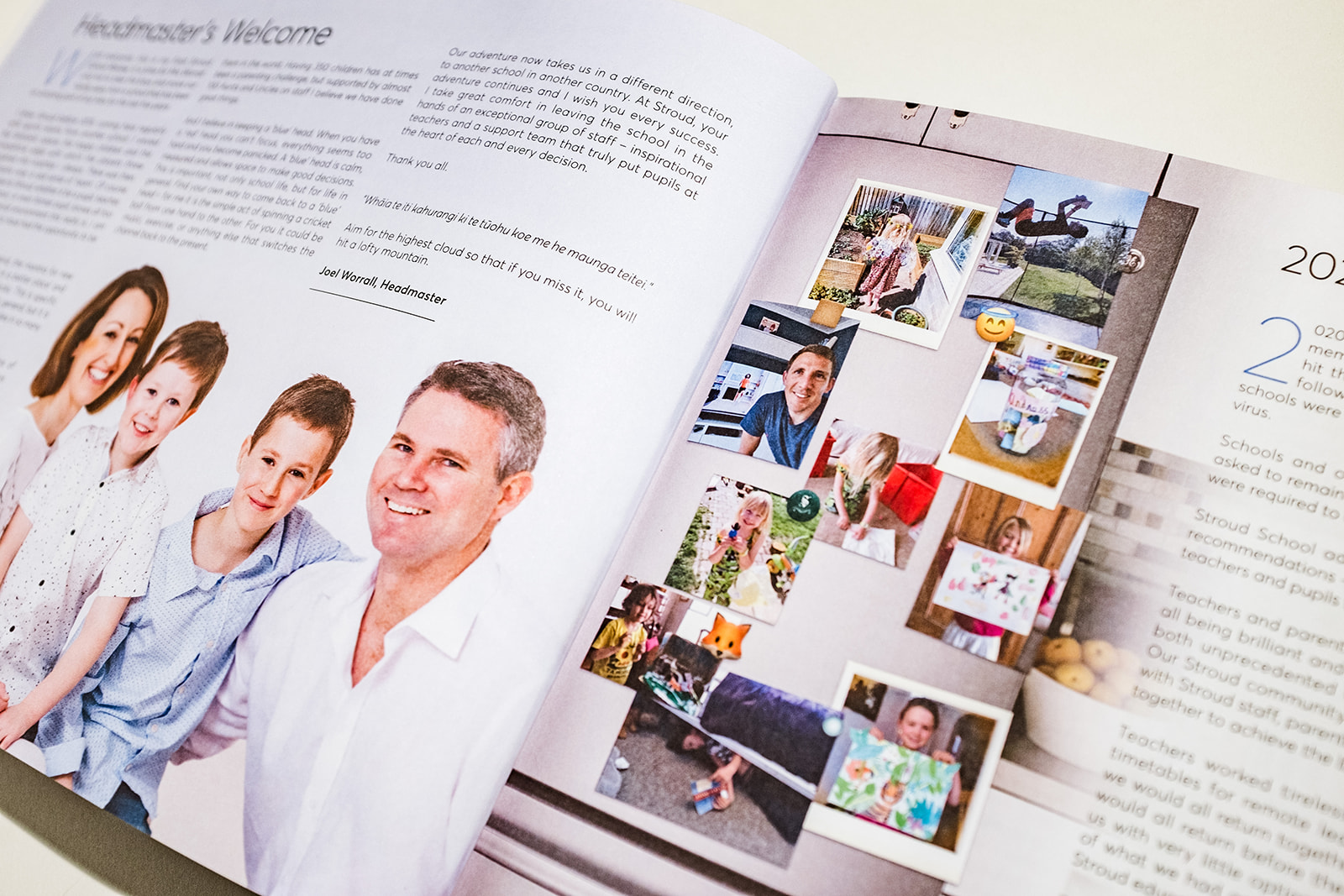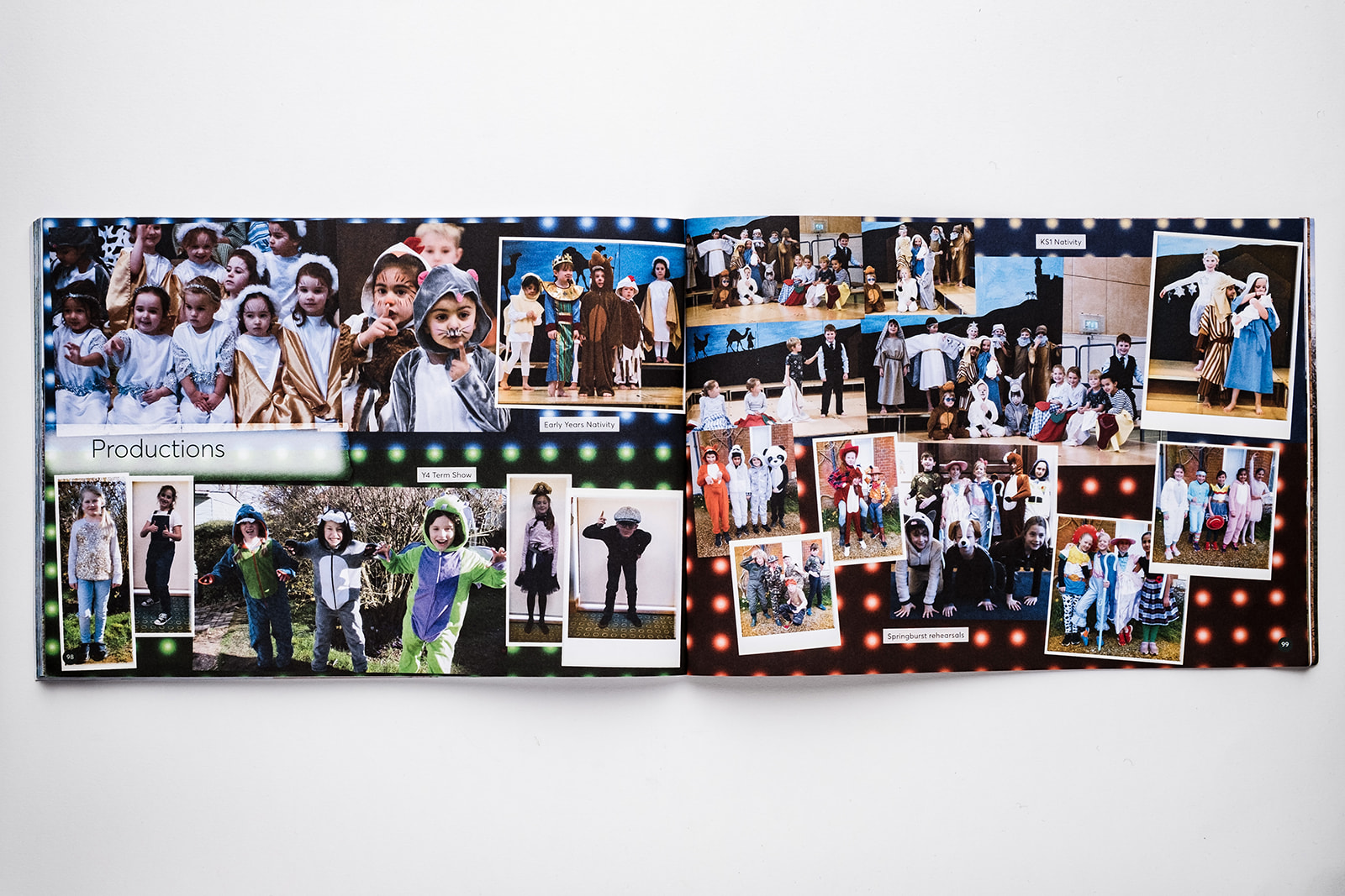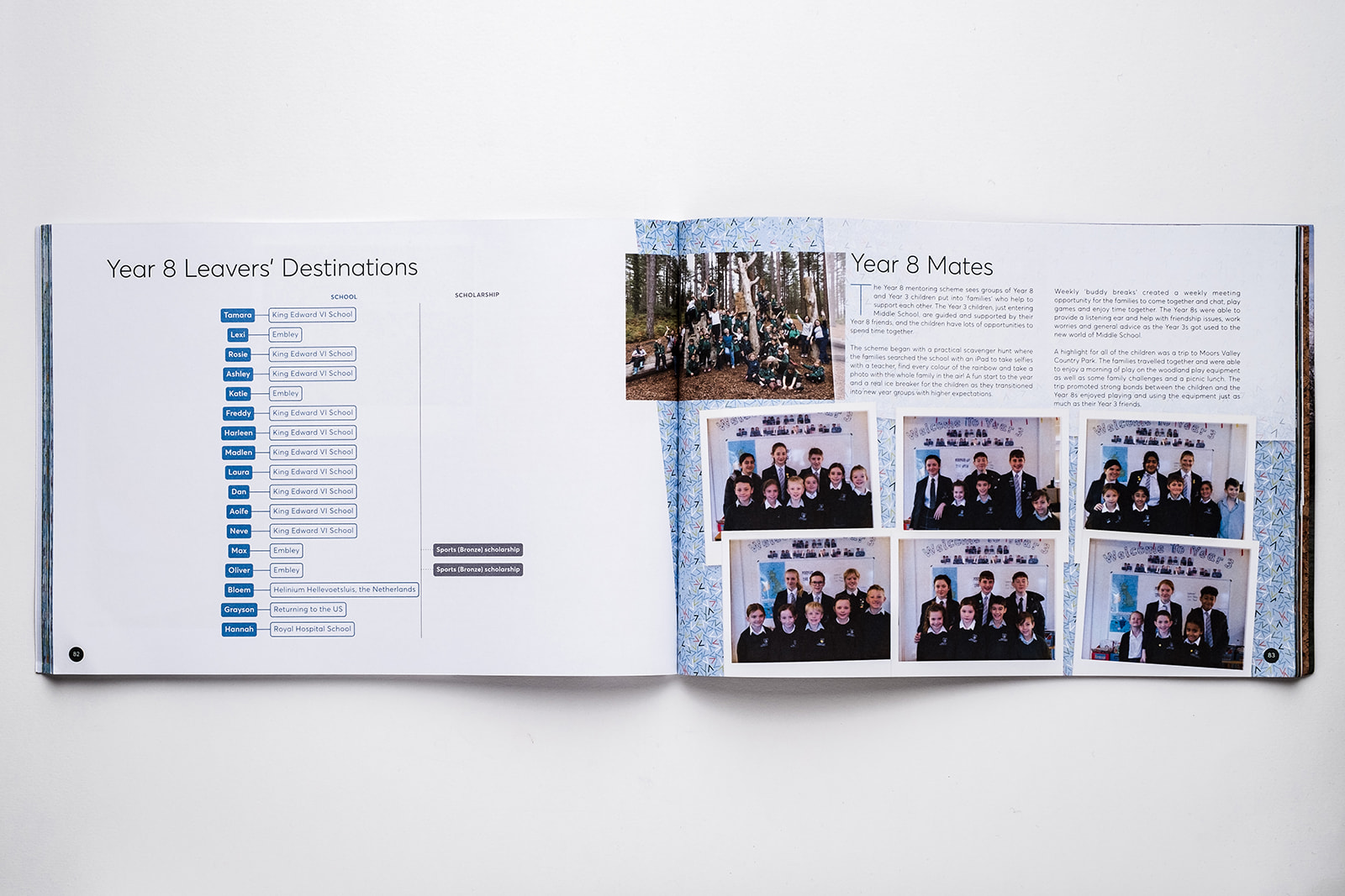 The school's end of year magazine is a celebration of the school community from the previous academic year. Each student writes a few words to express their highlights of the year. We used a handwritten typeface and post-it style graphic for this content to show the voice of each student as distinct from the voice of the staff. Images and graphics for school activities are processed and designed like a scrapbook to suggest the busy, lively and exciting life of the school.