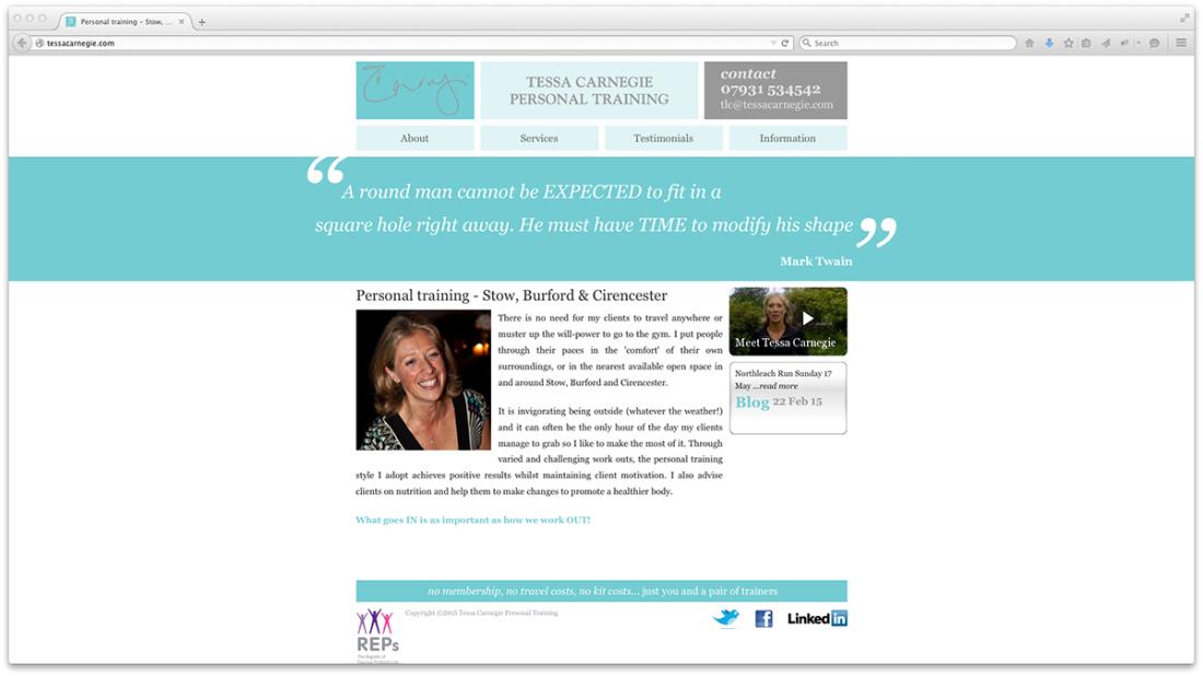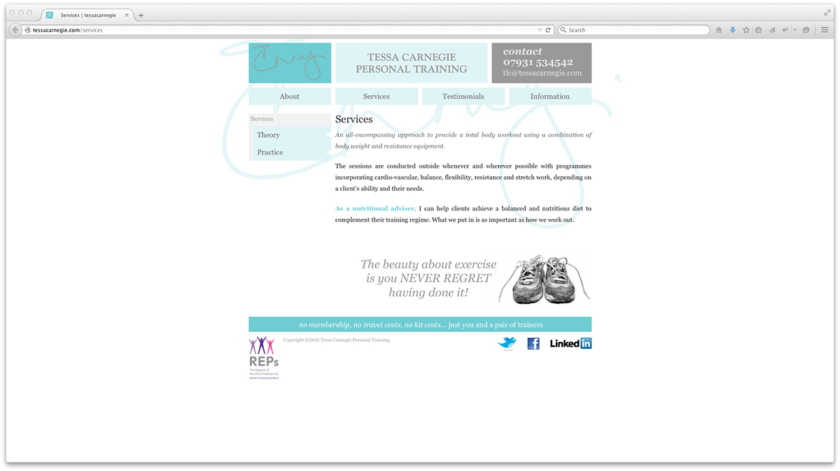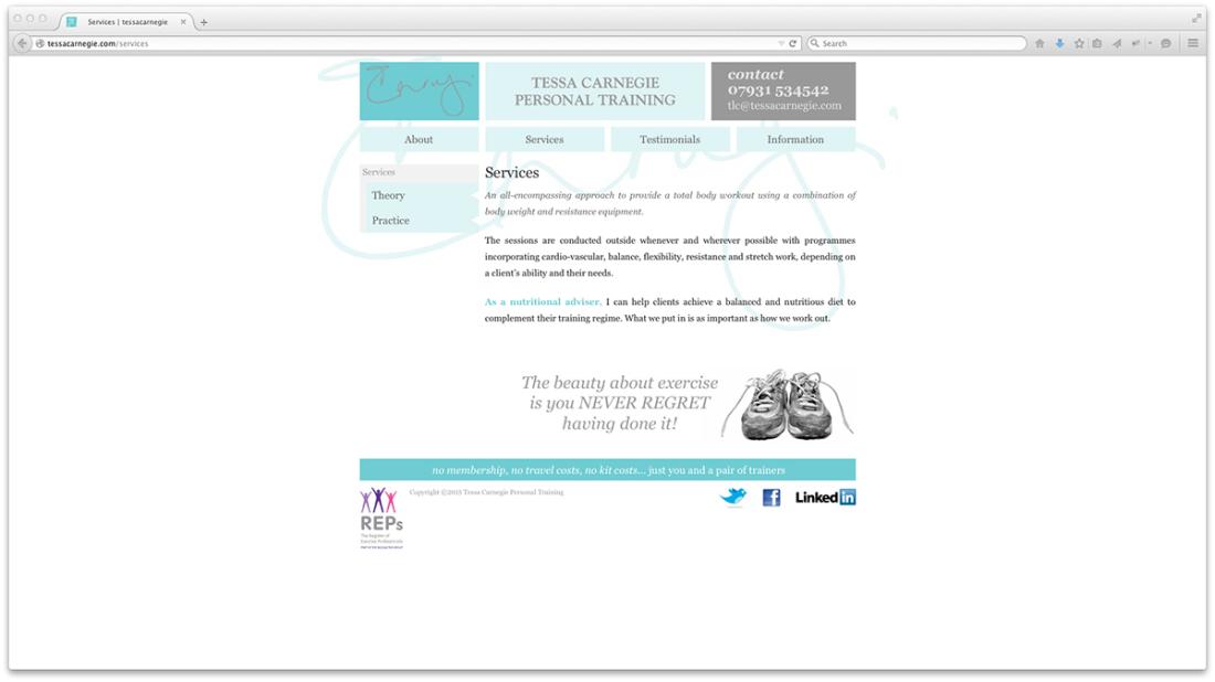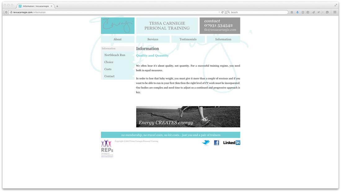 For Tessa Carnegie Personal Trainer, we used Tessa's signature for her visual identity and mark. The cards were printed two colour, Pantone Cool Grey and a Pantone green and used GF Smith Colorplan White Frost with Fabric embossing.