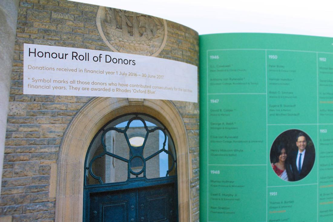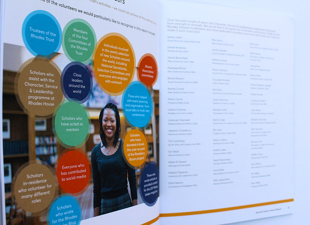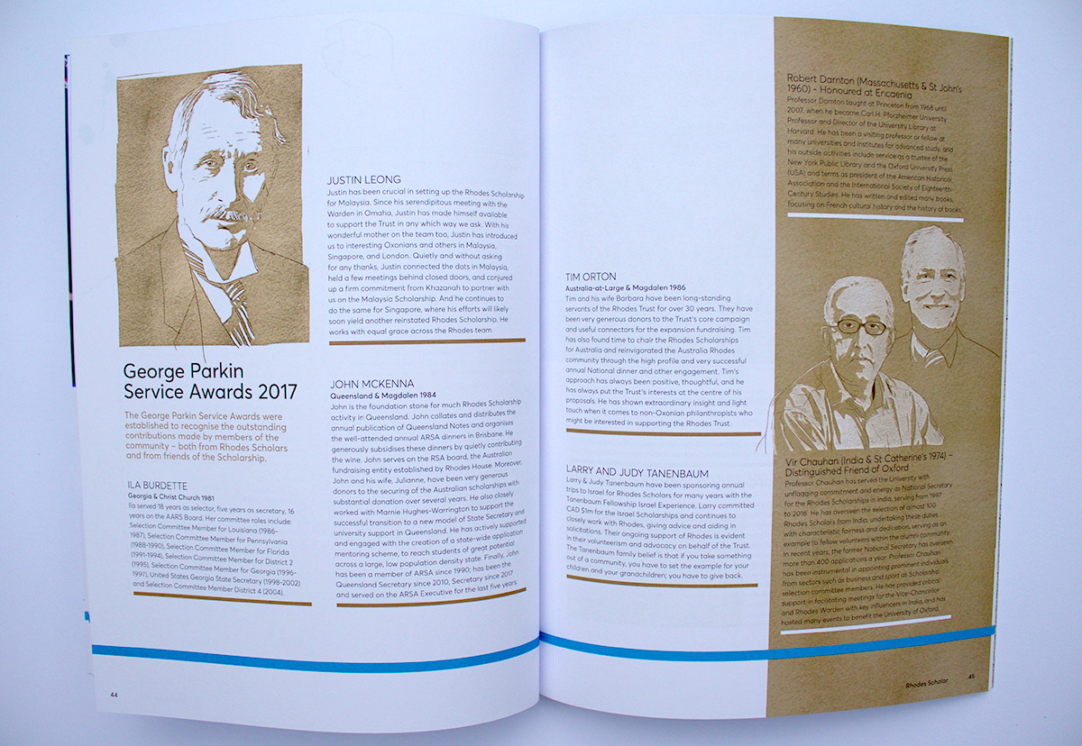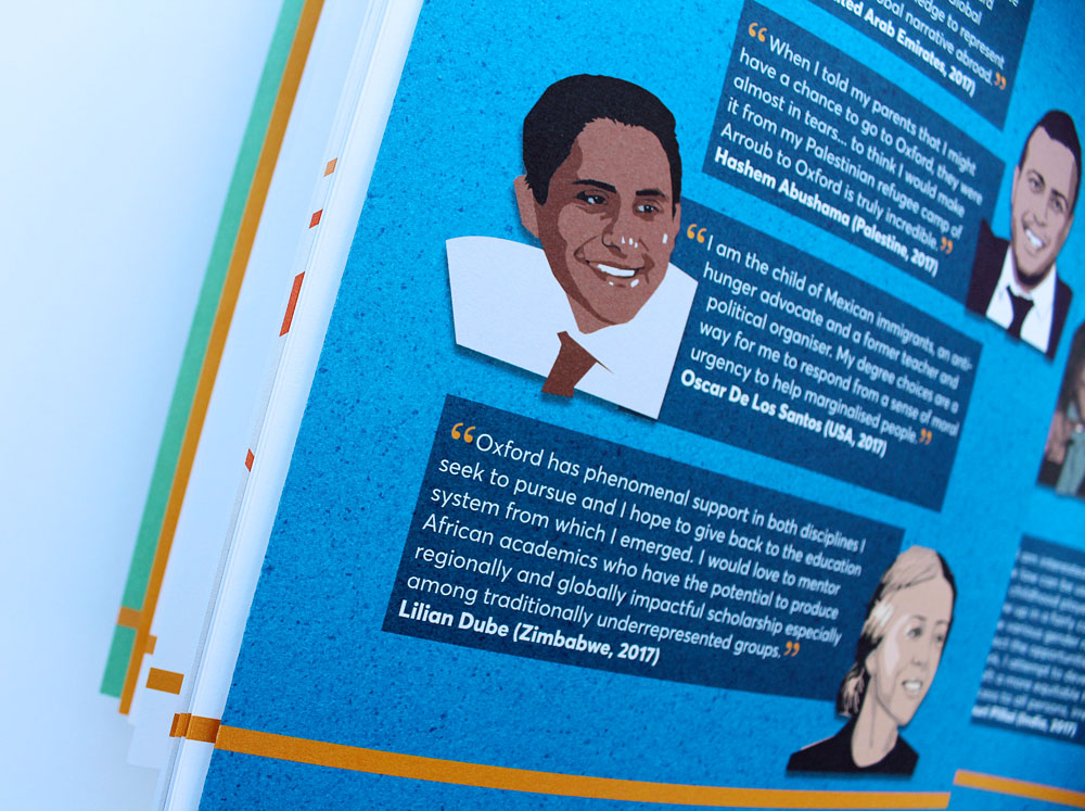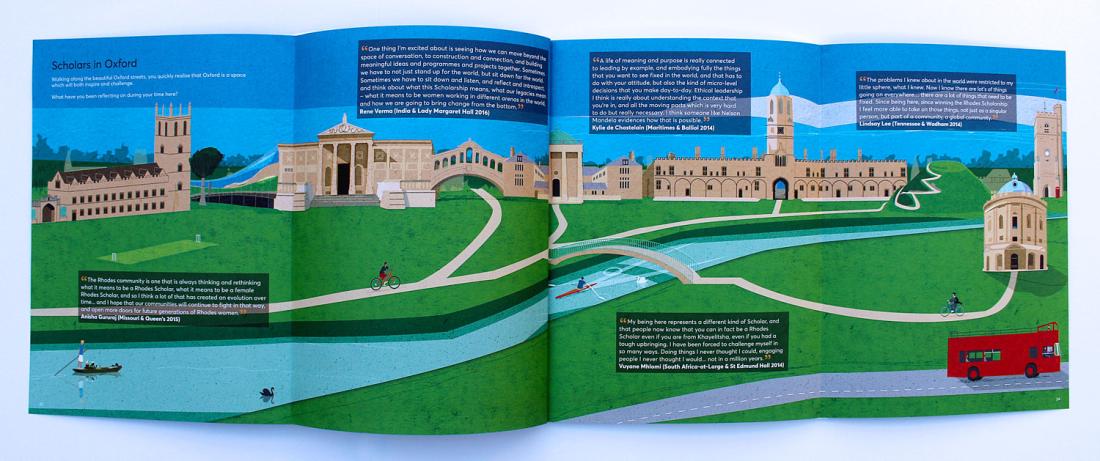 The Annual Report for 2017 includes a throw-out double spread of our illustration of a contrived Oxford panorama of iconic architecture and student-life highlights. On the reverse fold-out pages are our illustrations of current Rhodes Scholars with their words describing their Oxford and Rhodes experience.