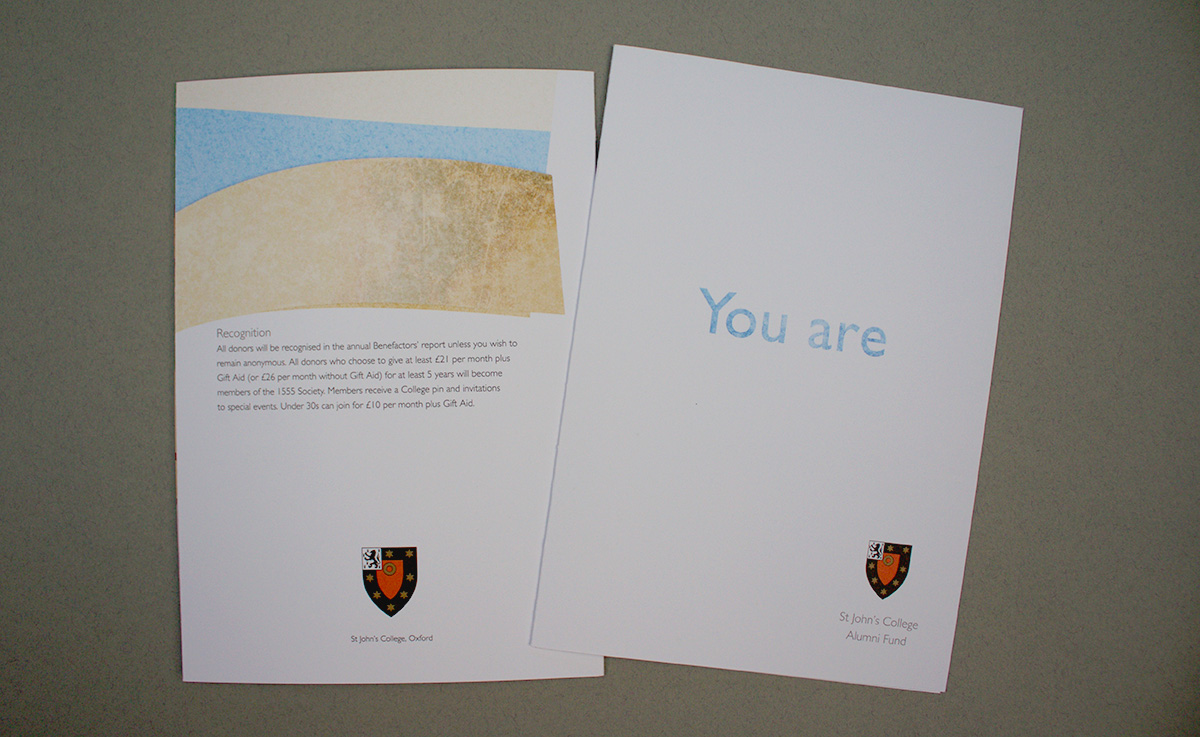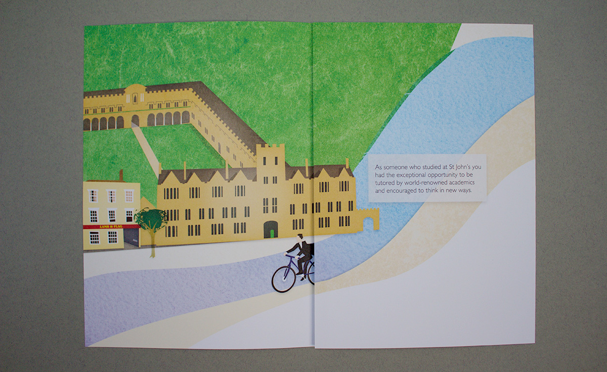 The first spread then reminded alumni what opportunities they enjoyed at St John's, including visual prompts such as St John's architecture and icons, and wider Oxford experiences. The last full spread showed the full picture and the call to action; to support the work of St John's in providing all their students a world-class education.