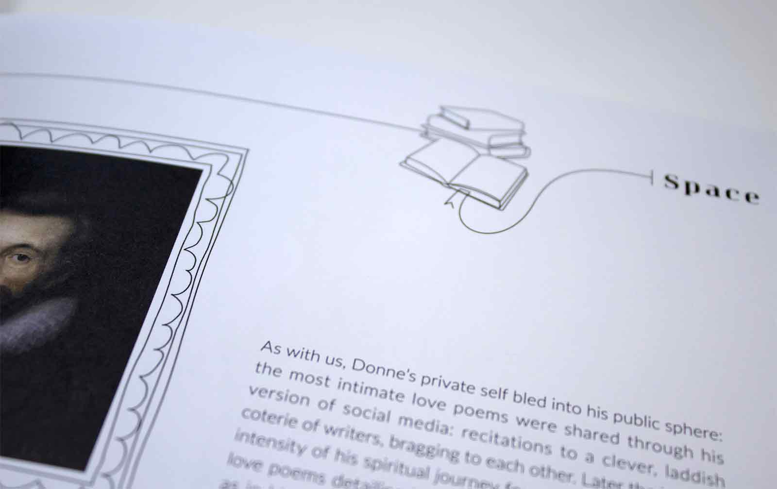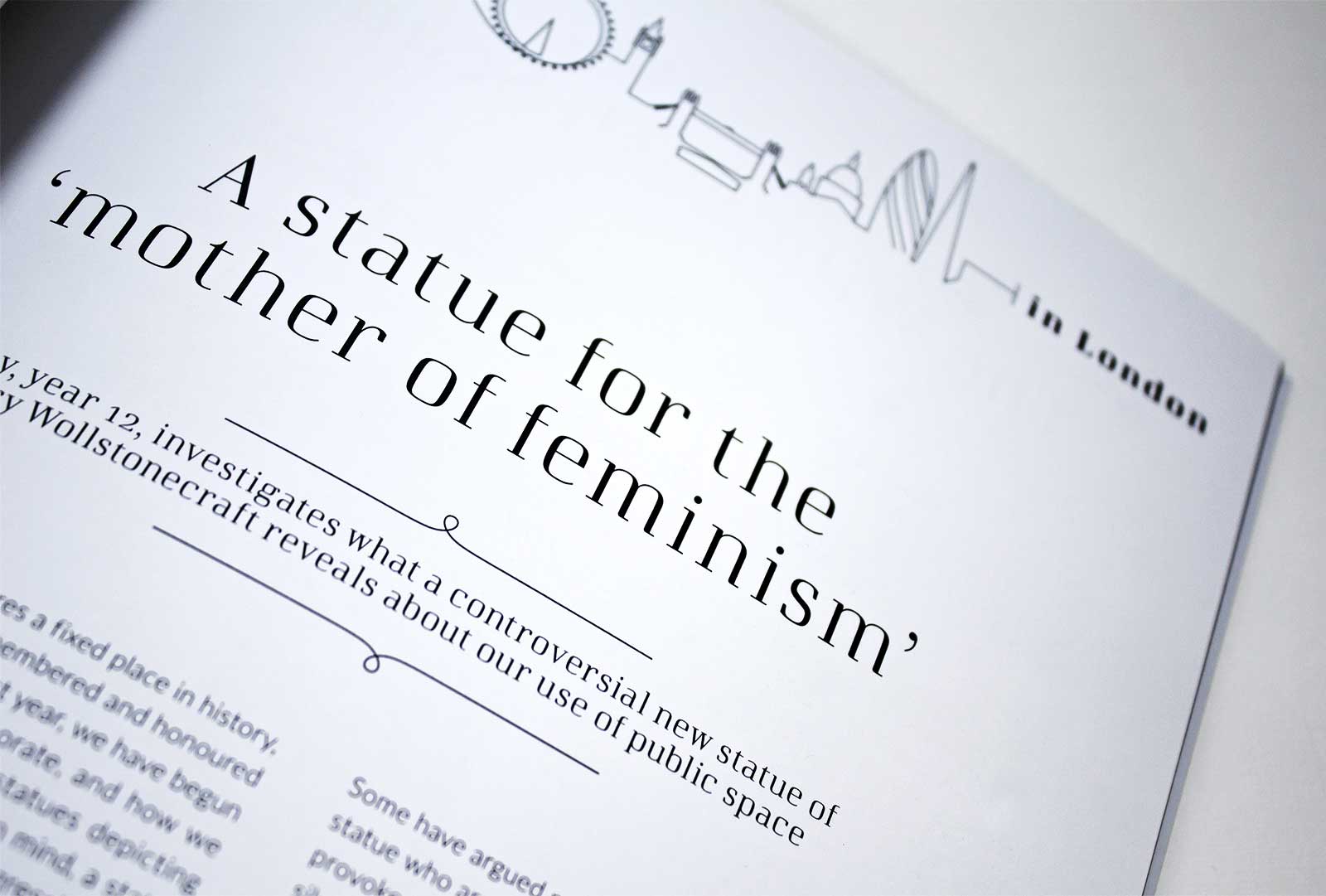 The content was arranged in five sections and for each section we designed a suitable page header, in the style of a single line illustration. Most of the written pieces were presented on a spread with some students' artwork which we used creatively to work with the content and tone of the related article.