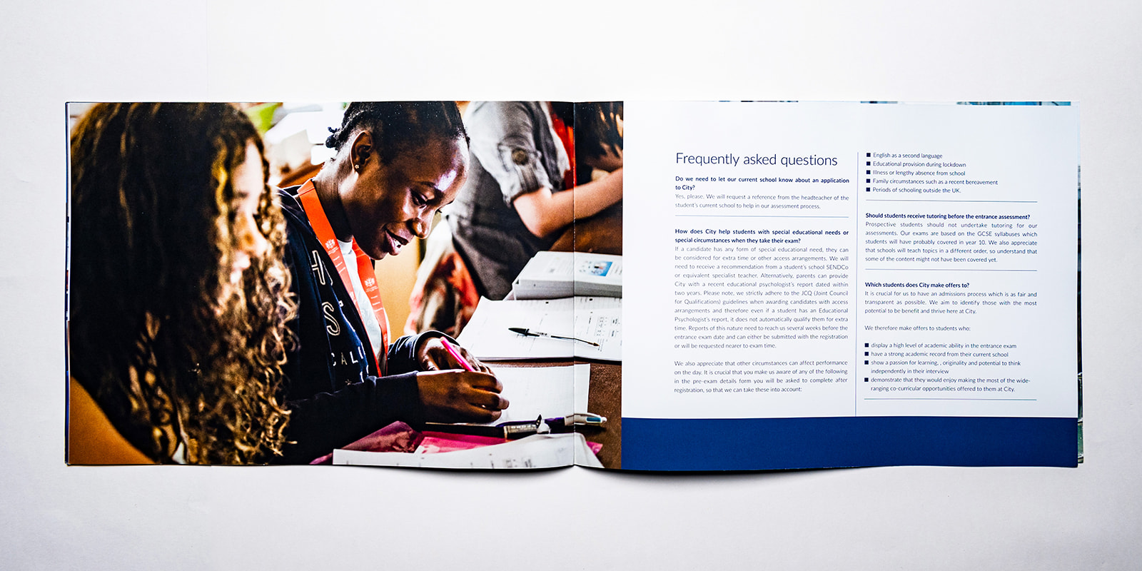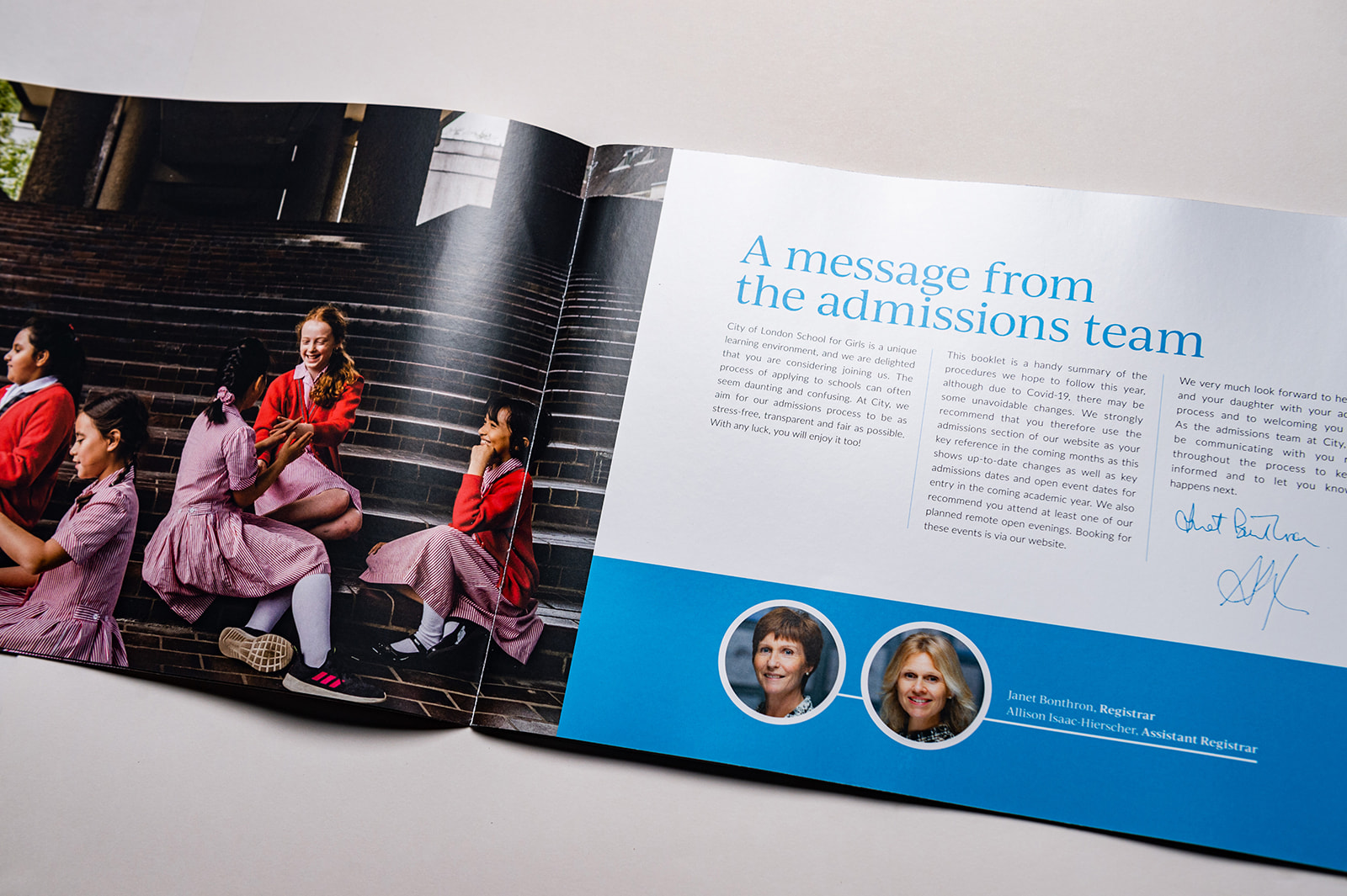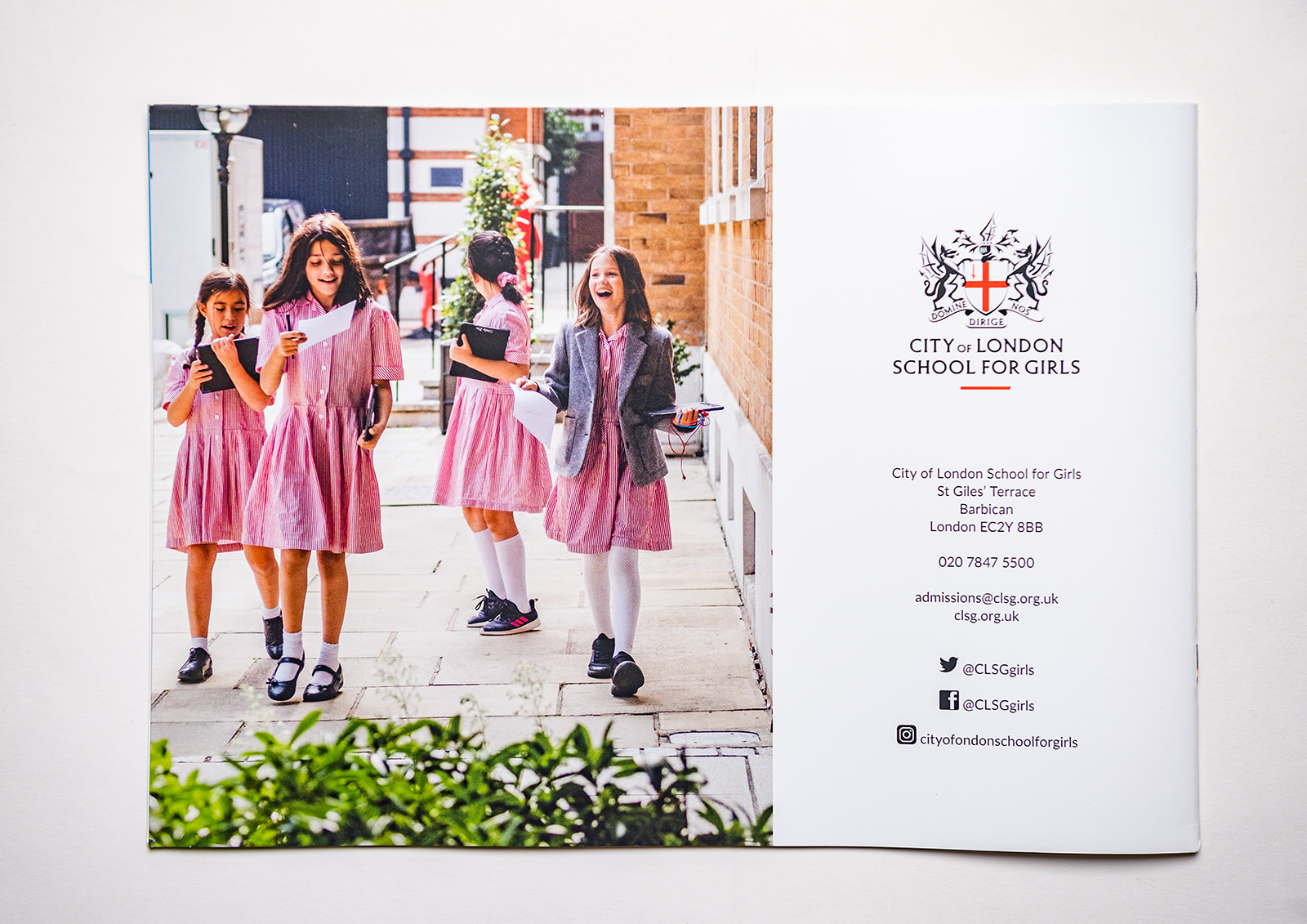 We've worked with City School for Girls in London on a number of design projects including brand and visual identity development guidelines. These brochure were the first print projects to put into practice the new identity. The new brand typefaces, colours, and style and use of imagery are demonstrated through a set of three A4 landscape brochures with a focus on admissions information and engagement.