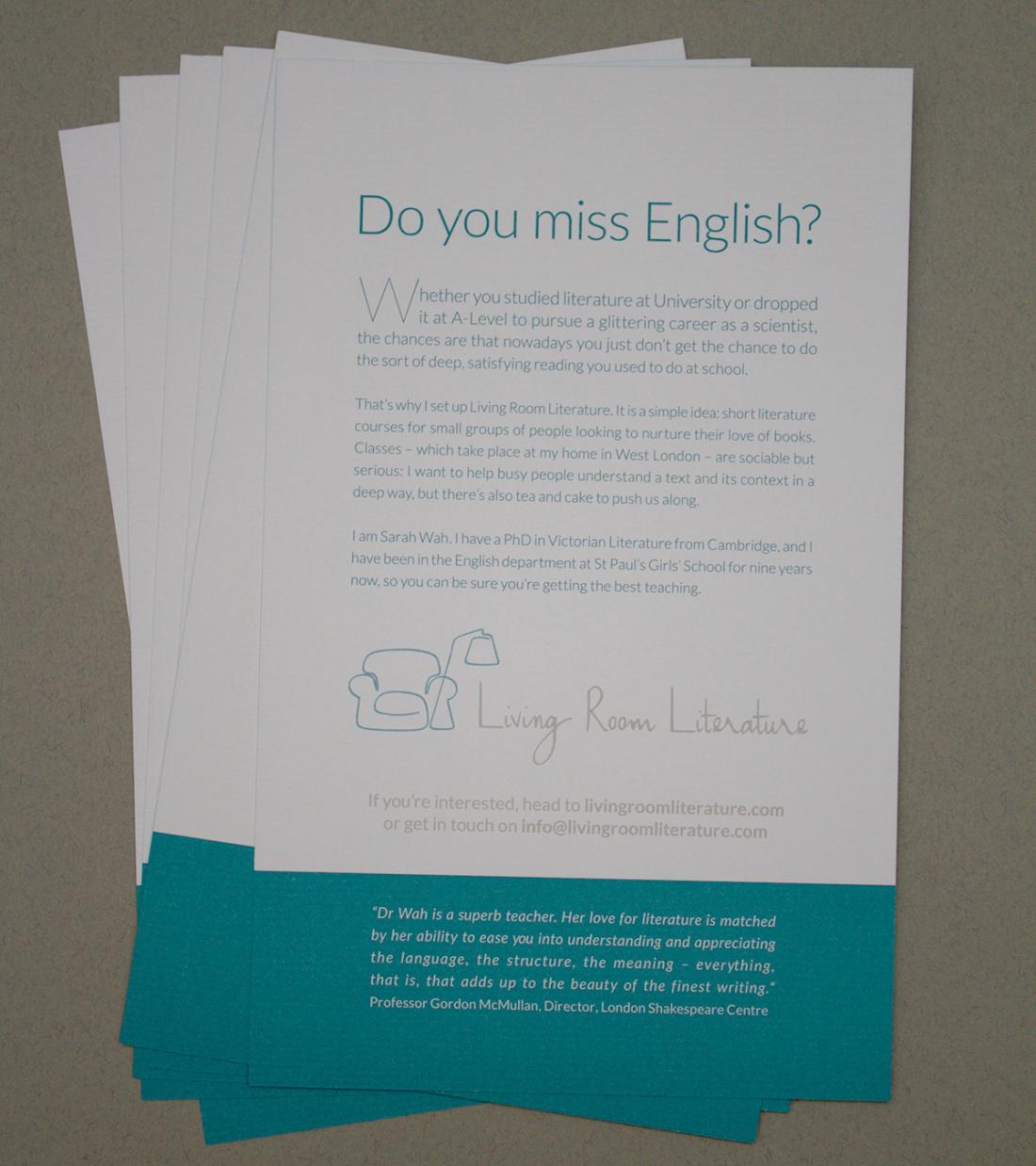 We designed this flyer to advertise new classes based in London for small literature reading and discussion groups for adults. The flyer design needed to work with the existing visual identity of the brand and the website. For the print we used just two colours: Pantone 7474 (green) and Pantone Cool Gray 5. The stock was Conqueror Laid Brilliant White.