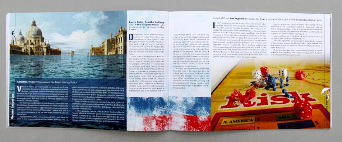 This issue of Paulina is the third we have designed for St Paul's Girls' School, their annual magazine. The theme was 'Risk' so we developed a graphic for the margin to work as a flip-book; a character climbing up the left hand pages and then parachuting down the right hand pages - risky. Other fun elements to design for the text included a letter from a gladiator, asteroids and a trip to CERN, a graphic for the probability Monty Hall problem, and for the English department, an illustration for the cadavres exquis game, used by the students to help them to write 'risky' poetry.