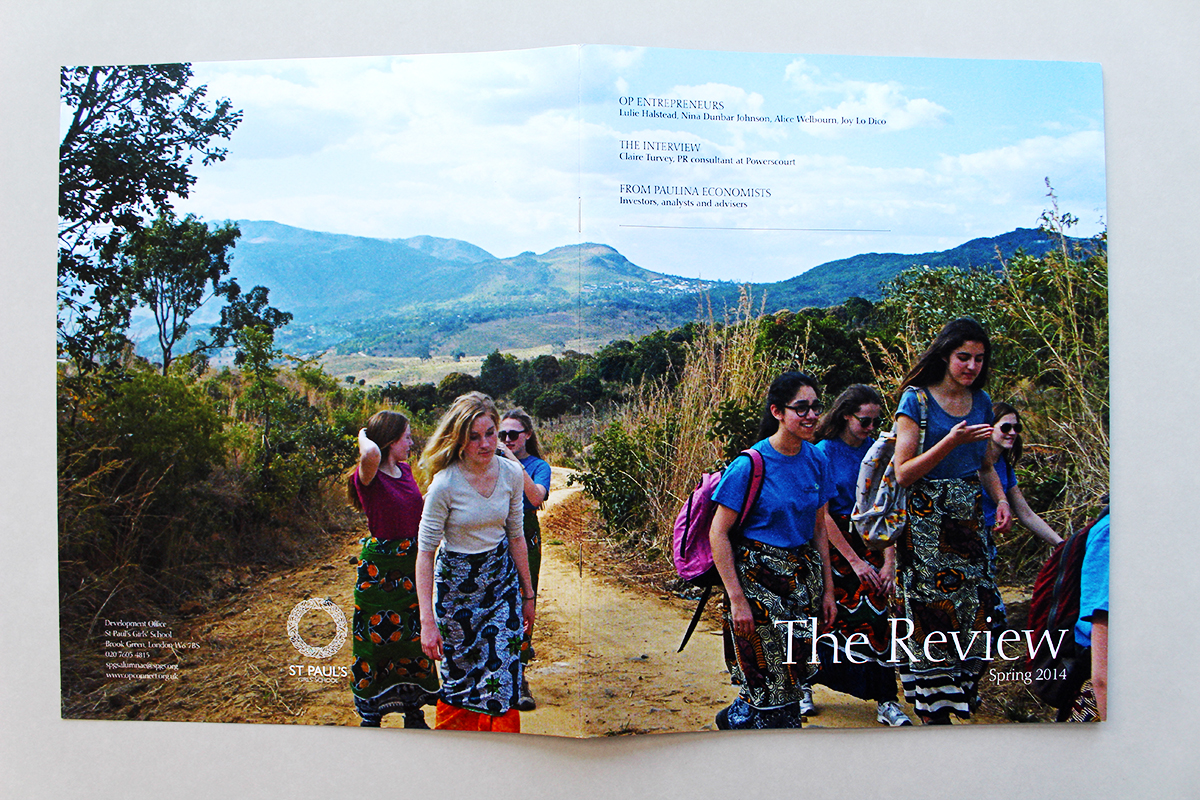 Each annual edition of the St Paul's Girls' School magazine Paulina has a theme; this year it was 'Food for Thought'. We design key graphic features which are consistent through each edition. For this issue, we made good use of Pantone Orange 021 to add vibrancy and a lush richness of colour, in keeping with the idea of glorious food. The borders always include the subject title and this year had the addition of a knife and fork, so each spread took on the appearance of a place setting. We used the cutlery handle engraving as the inspiration for the design for the bespoke drop caps.
