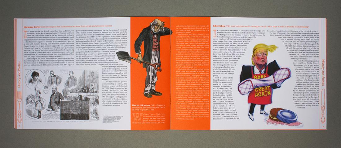 Subject specific graphics we designed for this edition included amongst others: Tim Peake and student physicists 'beamed up' with their space plants; two food bank pieces designed as food packaging; an illustration of Donald Trump 'baking' a new federal cake; an illustrative mash-up of Italian idioms and the pantry of the French language (including Proust on madeleines and a Camembert roundabout...); an infographic to show the food intake of mice and elephants in comparison to their relative mass; and Italian opera singers tempting each other with spaghetti (see Rossini's The Italian Girl in Algiers for an explanation).
