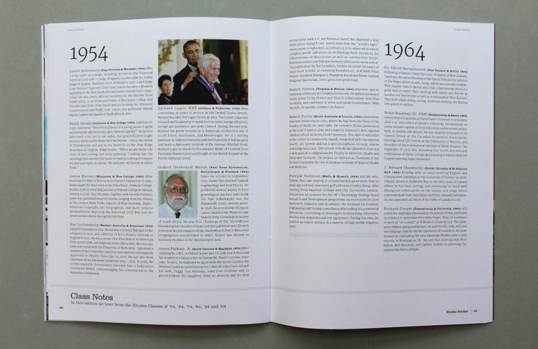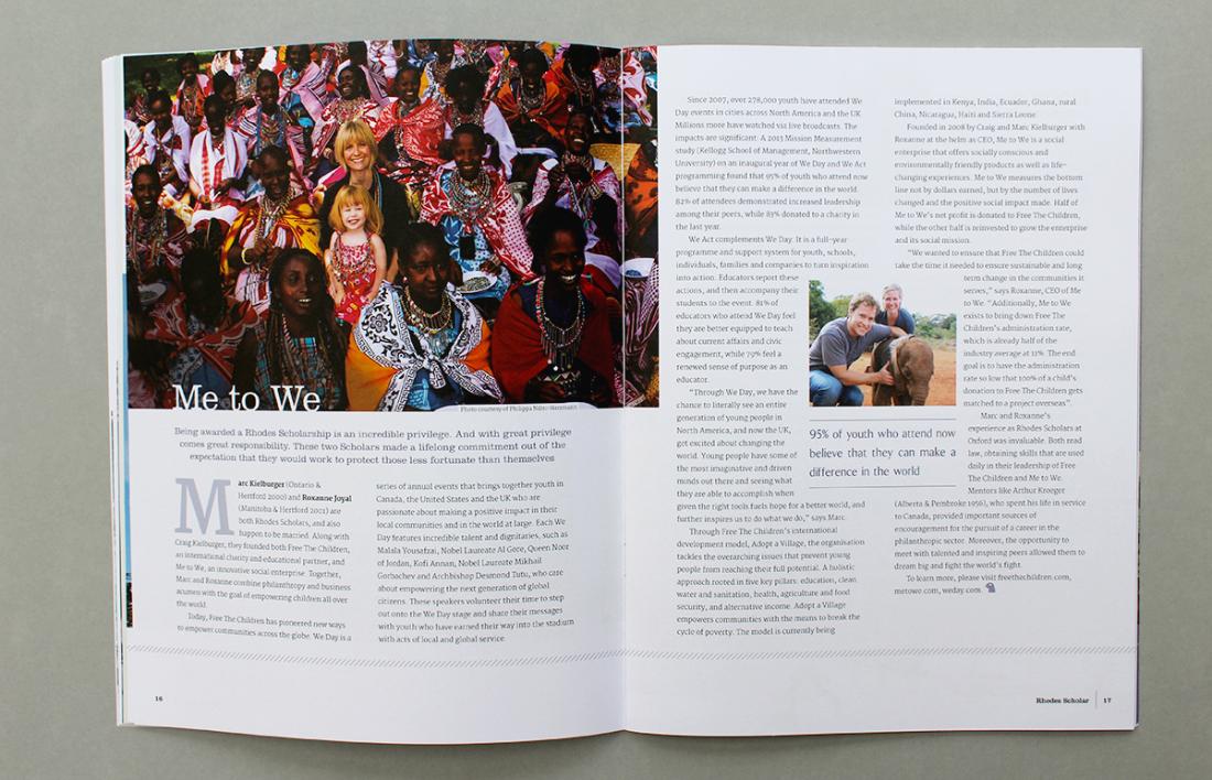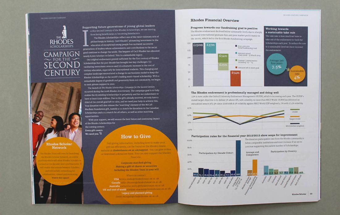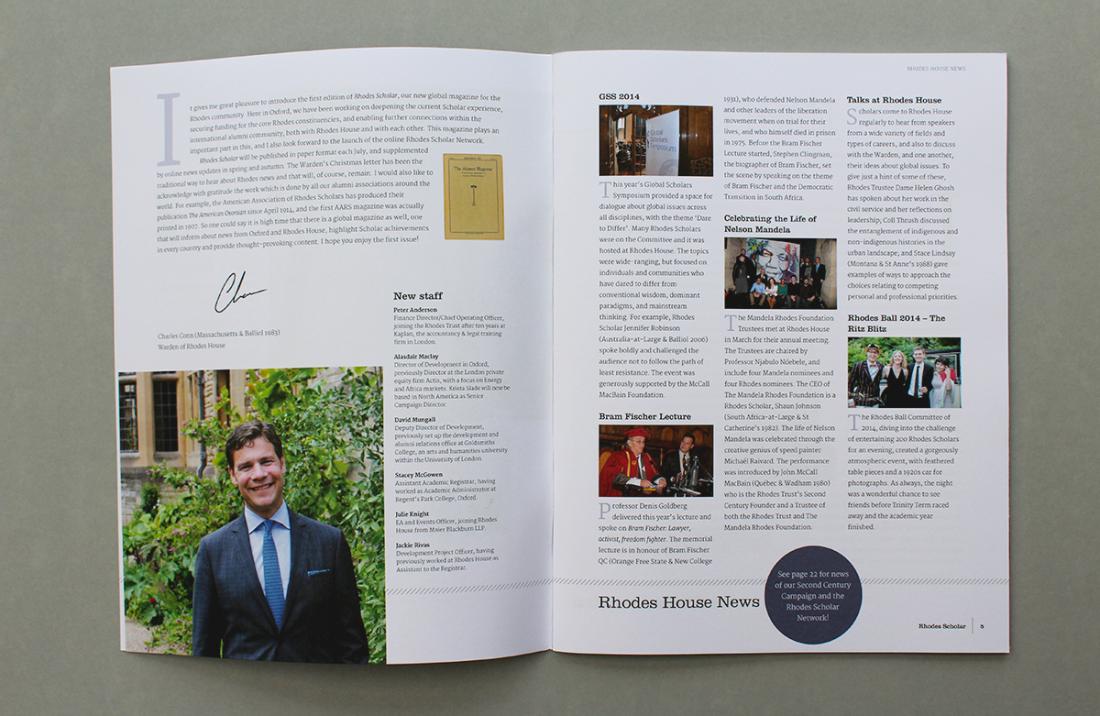 The Rhodes Scholar magazine is a new publication for The Rhodes Trust. We worked with the Communications Manager to design the magazine to reflect the dynamic Rhodes community both past and present. Core fonts, colours and layout give the magazine a discrete identity but each spread was given a different graphic treatment to evoke the vibrant and distinct character of Rhodes scholars.