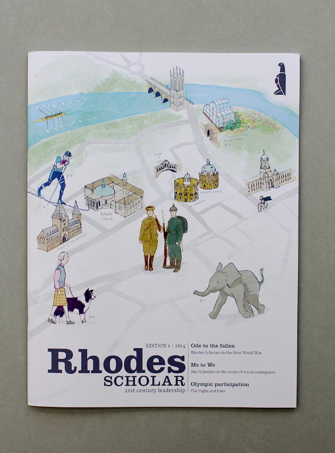 To give the launch issue a stand-out cover, we developed and drew an illustrative visual, drawing on key feature articles from the magazine and placing these on a street map of Oxford (with Oxford iconic landmarks, Rhodes House being in the centre), to guide the reader into the magazine, and to help them call to mind their time in Oxford as a Rhodes scholar.