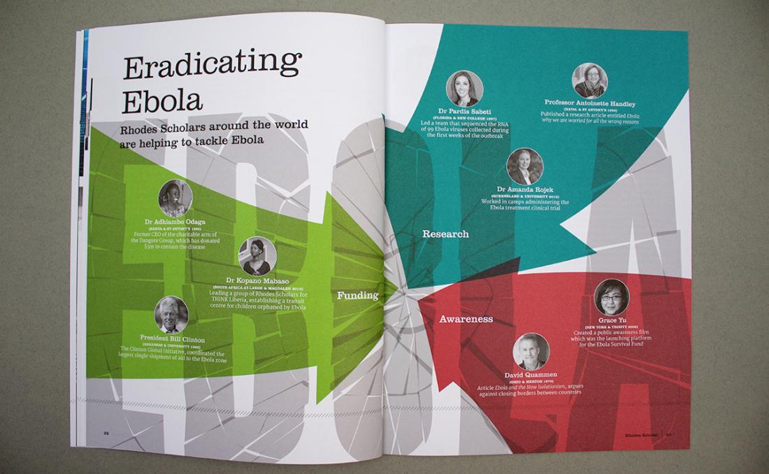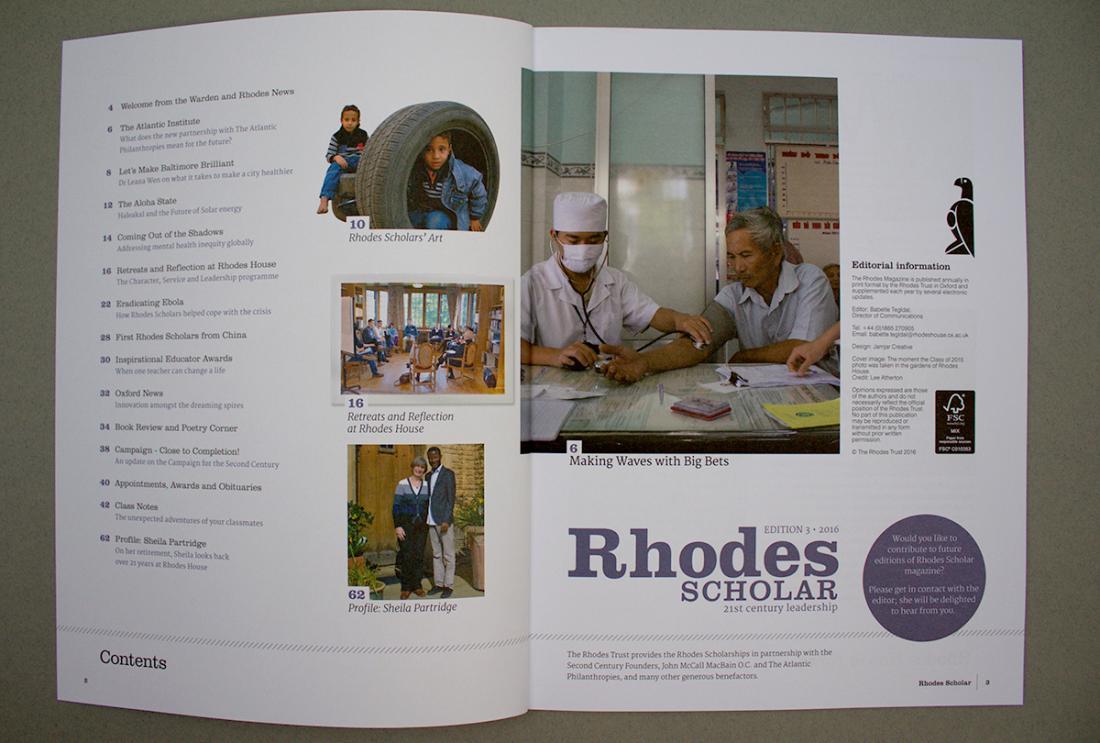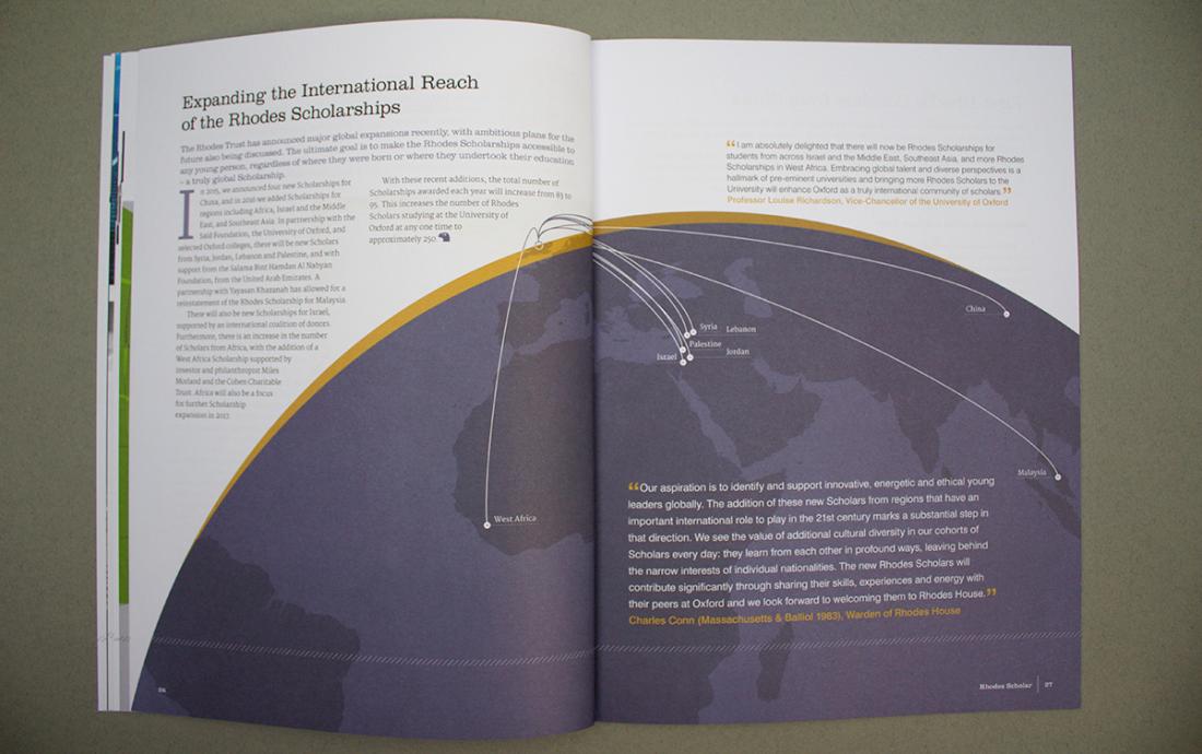 In this 2016 edition of Rhodes Scholar, we highlighted: the development of the Scholarships with their new partnership with The Atlantic Philanthropies; the work of Scholars across the world in the medical and health sectors; recognising inspirational educators nominated by current Scholars; the growing global reach of the Schorships with new regions and nations, to name a few. We used the design established with the first issue as the backdrop for new layout interpretations plus illustrations and graphics for articles including a drawing for a piece which discusses if Shakespeare invented characters, a graphic to visually reflect the impactful work of Scholars in the fight to eradicate Ebola, a 'photo album' pictorial of a look back on the year, a world graphic to show the international expansion of the Scholarships... and a mallard.