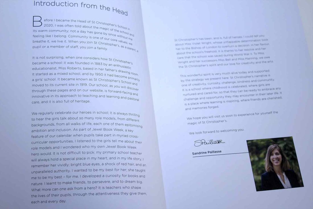 St Christopher's School needed a brochure to communicate their new strategy plan for the next three years in the development of the school. The brochure included using commissioned imagery from our preferred photographer, enabling us to use lively, documentary style photographs large, across spreads, for great impact. The imagery also allowed us to add features such as post-it notes and highlighted text to photographs so the students appeared to interact with the text as graphic elements.