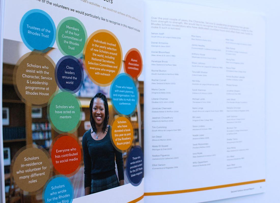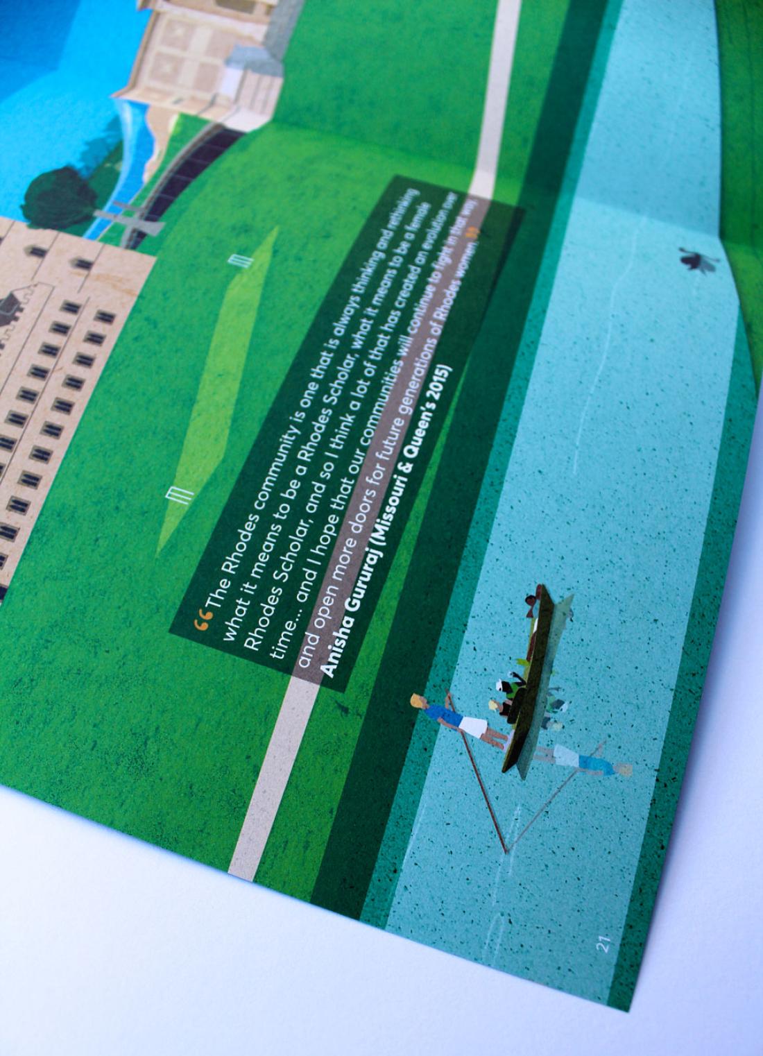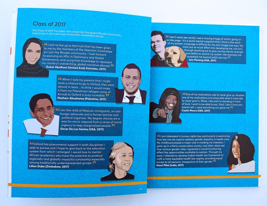 The Annual Report for 2017 includes a throw-out double spread of our illustration of a contrived Oxford panorama of iconic architecture and student-life highlights. On the reverse fold-out pages are our illustrations of current Rhodes Scholars with their words describing their Oxford and Rhodes experience.