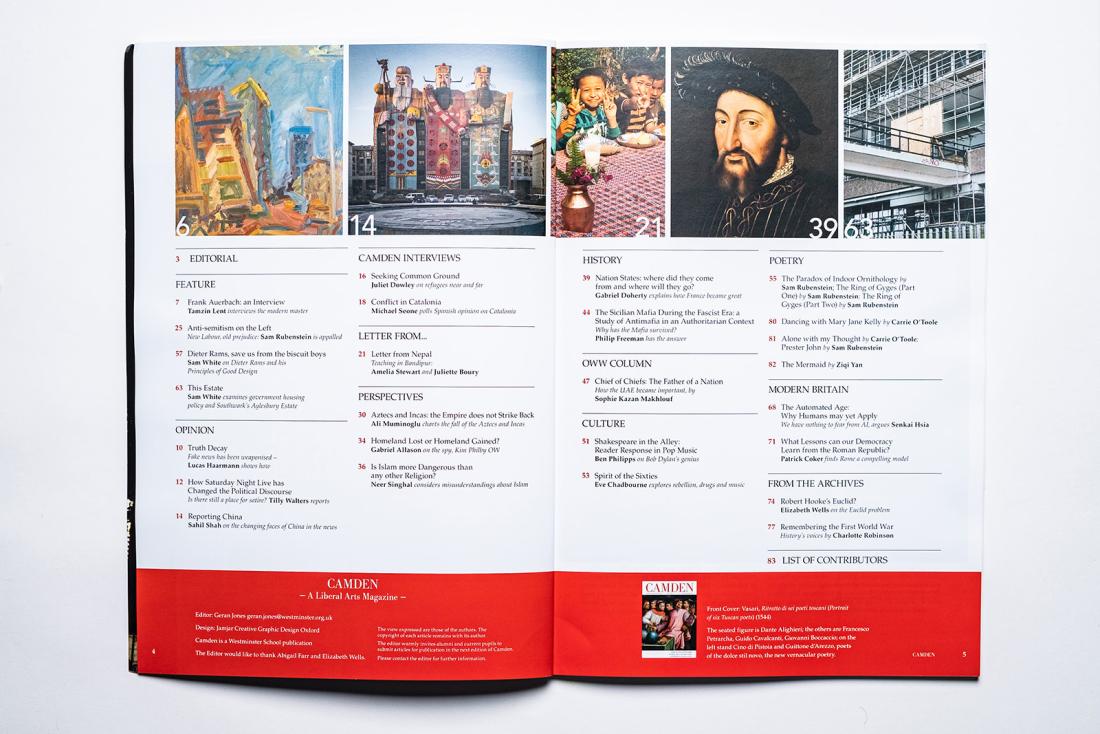 This annual publication celebrates the academic research and writing of the students. We redesigned the magazine to reflect the mature and erudite content, ensuring that Camden is considered a well-respected scholarly publication. The audience is parents, students, alumni and universities; the design emphasises the formal and reputable nature of the writing.